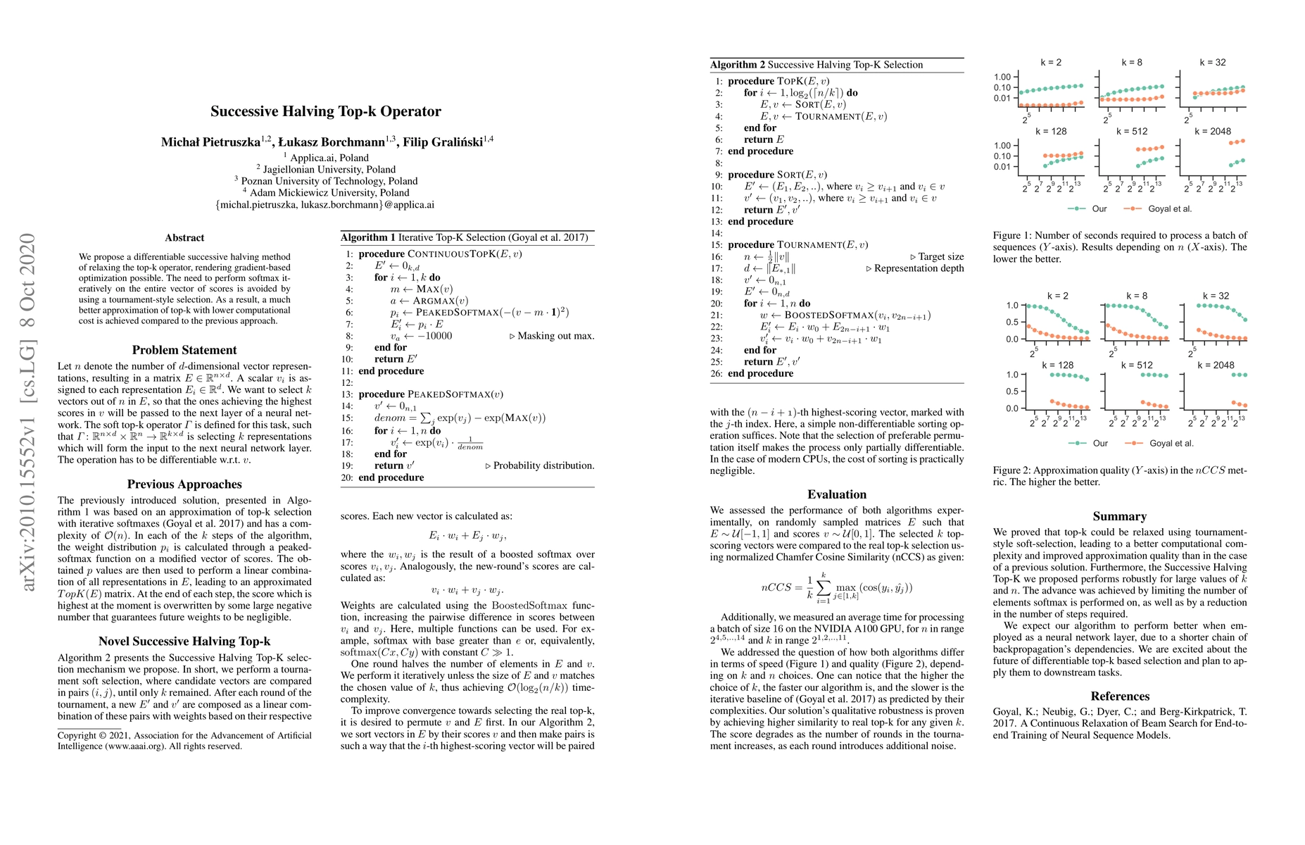 This paper proposes a differentiable successive halving method to approximate the top-k operator, enabling gradient-based optimization. It avoids the need for iterative softmax by employing a tournament-style selection, resulting in a more efficient approximation with lower computational costs compared to previous methods.