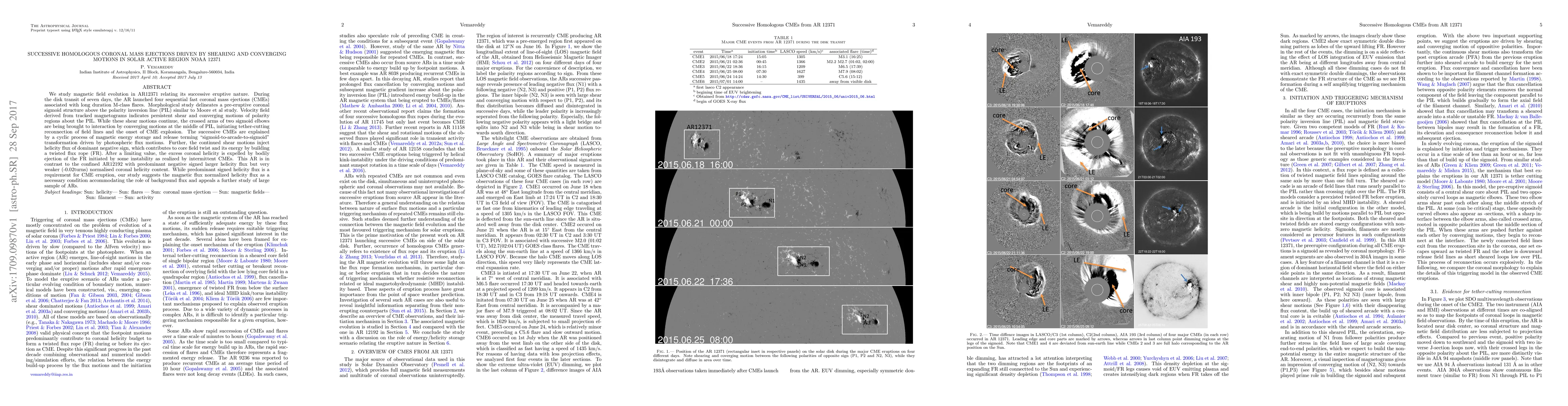 We study magnetic field evolution in AR12371 relating its successive eruptive nature. During the disk transit of seven days, the AR launched four sequential fast coronal mass ejections (CMEs) associated with long duration M-class flares. Morphological study delineates a pre-eruptive coronal sigmoid structure above the polarity inversion line (PIL) similar to Moore et al study. Velocity field derived from tracked magnetograms indicates persistent shear and converging motions of polarity regions about the PIL. While these shear motions continue, the crossed arms of two sigmoid elbows are being brought to interaction by converging motions at the middle of PIL, initiating tether-cutting reconnection of field lines and the onset of CME explosion. The successive CMEs are explained by a cyclic process of magnetic energy storage and release terming "sigmoid-to-arcade-to-sigmoid" transformation driven by photospheric flux motions. Further, the continued shear motions inject helicity flux of dominant negative sign, which contributes to core field twist and its energy by building a twisted flux rope (FR). After a limiting value, the excess coronal helicity is expelled by bodily ejection of the FR initiated by some instability as realized by intermittent CMEs. This AR is in contrast to the confined AR12192 with predominant negative signed larger helicity flux but very weaker (-0.02turns) normalised coronal helicity content. While predominant signed helicity flux is a requirement for CME eruption, our study suggests the magnetic flux normalized helicity flux as a necessary condition accommodating the role of background flux and appeals a further study of large sample of ARs.