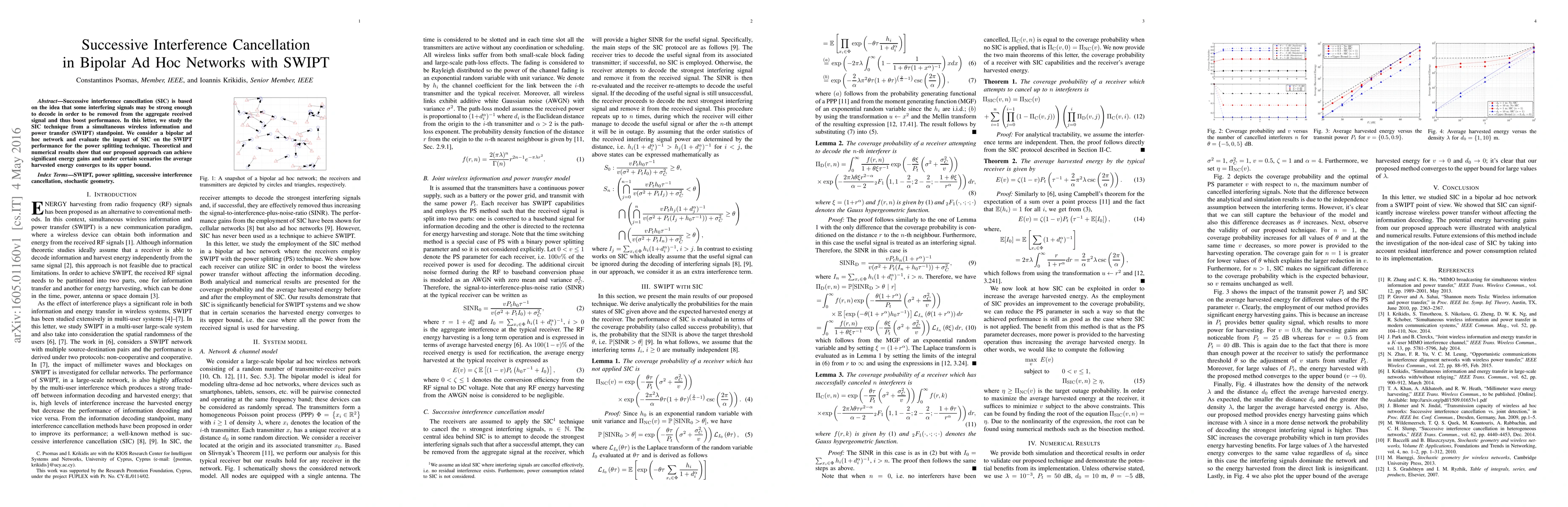 This paper investigates the application of successive interference cancellation (SIC) in bipolar ad hoc networks with simultaneous wireless information and power transfer (SWIPT), demonstrating significant energy gains and showing that average harvested energy can converge to its upper bound under certain conditions. The study evaluates the impact of SIC on SWIPT performance using the power splitting technique.