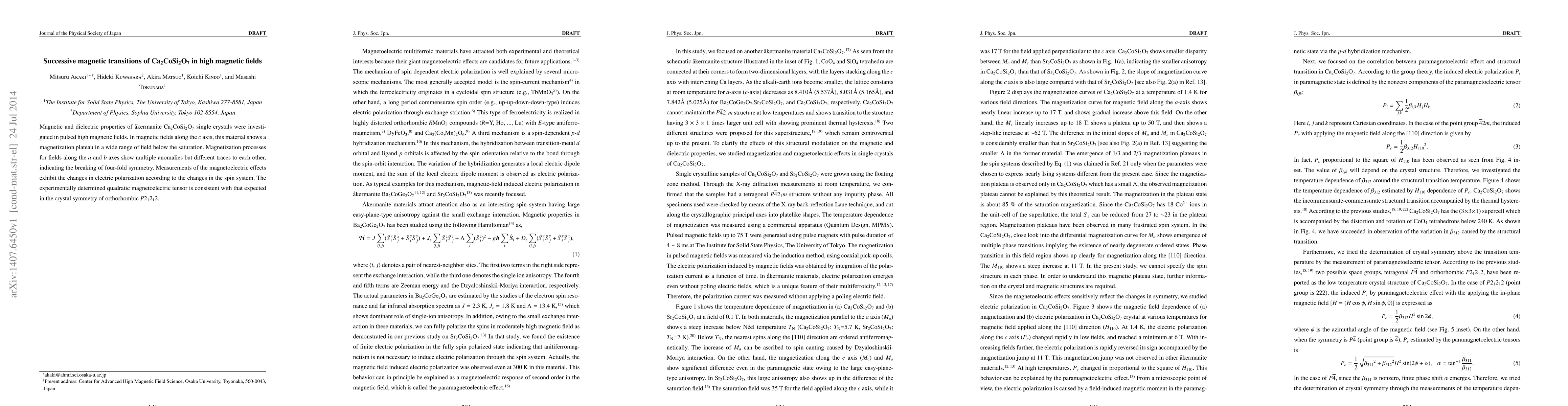 Magnetic and dielectric properties of \aa kermanite Ca$_2$CoSi$_2$O$_7$ single crystals were investigated in pulsed high magnetic fields. In magnetic fields along the $c$ axis, this material shows a magnetization plateau in a wide range of field below the saturation. Magnetization processes for fields along the $a$ and $b$ axes show multiple anomalies but different traces to each other, indicating the breaking of four-fold symmetry. Measurements of the magnetoelectric effects exhibit the changes in electric polarization according to the changes in the spin system. The experimentally determined quadratic magnetoelectric tensor is consistent with that expected in the crystal symmetry of orthorhombic $P2_12_12$.