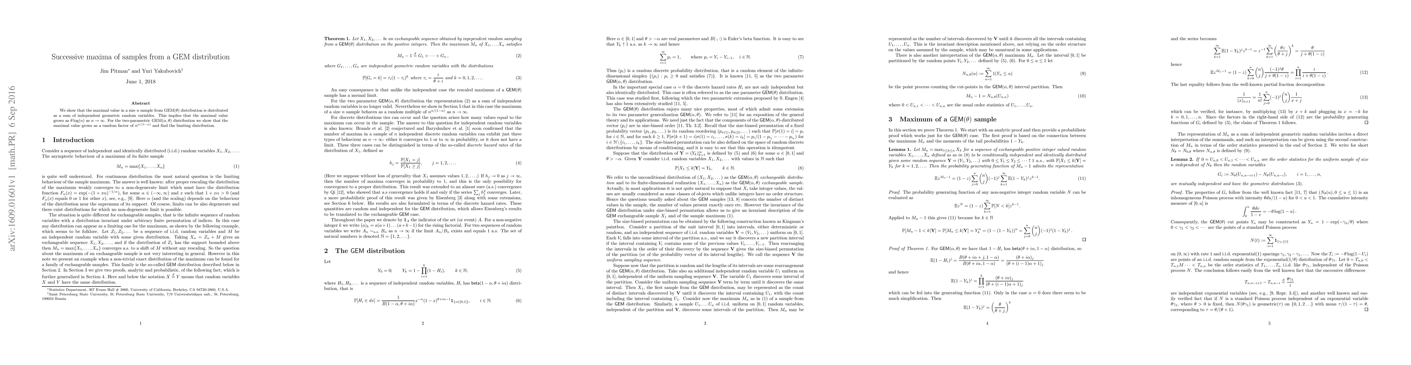 We show that the maximal value in a size $n$ sample from GEM$(\theta)$ distribution is distributed as a sum of independent geometric random variables. This implies that the maximal value grows as $\theta\log(n)$ as $n\to\infty$. For the two-parametric GEM$(\alpha,\theta)$ distribution we show that the maximal value grows as a random factor of $n^{\alpha/(1-\alpha)}$ and find the limiting distribution.