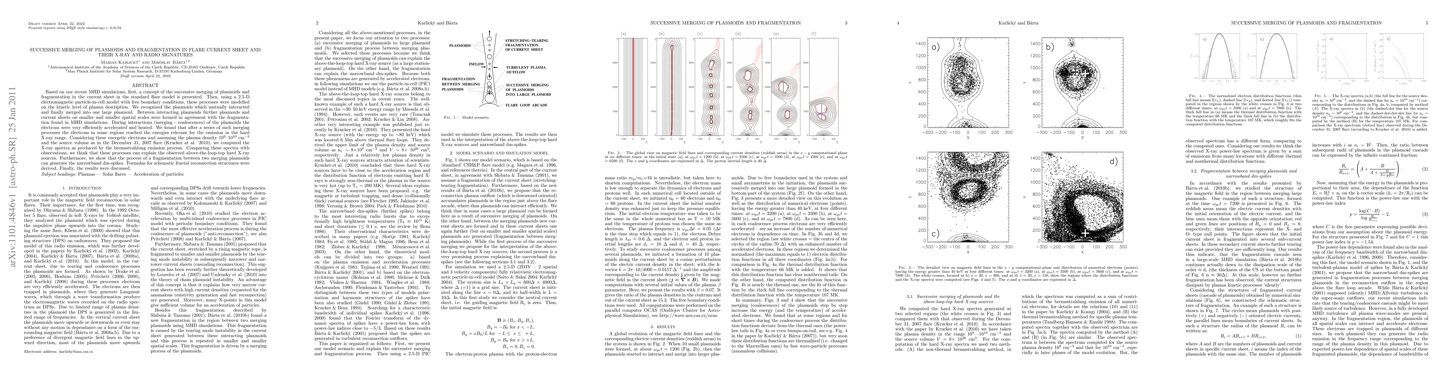 Based on our recent MHD simulations, first, a concept of the successive merging of plasmoids and fragmentation in the current sheet in the standard flare model is presented. Then, using a 2.5-D electromagnetic particle-in-cell model with free boundary conditions, these processes were modelled on the kinetic level of plasma description. We recognized the plasmoids which mutually interacted and finally merged into one large plasmoid. Between interacting plasmoids further plasmoids and current sheets on smaller and smaller spatial scales were formed in agreement with the fragmentation found in MHD simulations. During interactions (merging - coalescences) of the plasmoids the electrons were very efficiently accelerated and heated. We found that after a series of such merging processes the electrons in some regions reached the energies relevant for the emission in the hard X-ray range. Considering these energetic electrons and assuming the plasma density 10^9-10^10 cm^{-3} and the source volume as in the December 31, 2007 flare (Krucker at al. 2010, ApJ 714, 1108), we computed the X-ray spectra as produced by the bremsstrahlung emission process. Comparing these spectra with observations, we think that these processes can explain the observed above-the-loop-top hard X-ray sources. Furthermore, we show that the process of a fragmentation between two merging plasmoids can generate the narrowband dm-spikes. Formulas for schematic fractal reconnection structures were derived. Finally, the results were discussed.