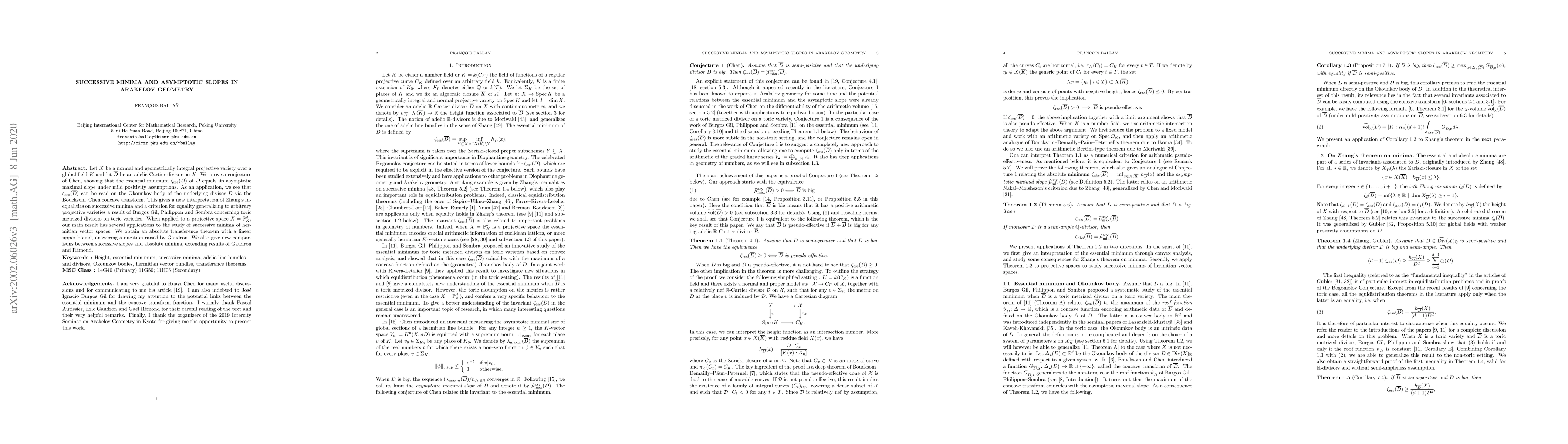 Let $X$ be a normal and geometrically integral projective variety over a global field $K$ and let $\overline{D}$ be an adelic Cartier divisor on $X$. We prove a conjecture of Chen, showing that the essential minimum $\zeta_{\mathrm{ess}}(\overline{D})$ of $\overline{D}$ equals its asymptotic maximal slope under mild positivity assumptions. As an application, we see that $\zeta_{\mathrm{ess}}(\overline{D})$ can be read on the Okounkov body of the underlying divisor $D$ via the Boucksom--Chen concave transform. This gives a new interpretation of Zhang's inequalities on successive minima and a criterion for equality generalizing to arbitrary projective varieties a result of Burgos Gil, Philippon and Sombra concerning toric metrized divisors on toric varieties. When applied to a projective space $X = \mathbb{P}_K^d$, our main result has several applications to the study of successive minima of hermitian vector spaces. We obtain an absolute transference theorem with a linear upper bound, answering a question raised by Gaudron. We also give new comparisons between successive slopes and absolute minima, extending results of Gaudron and R\'emond.