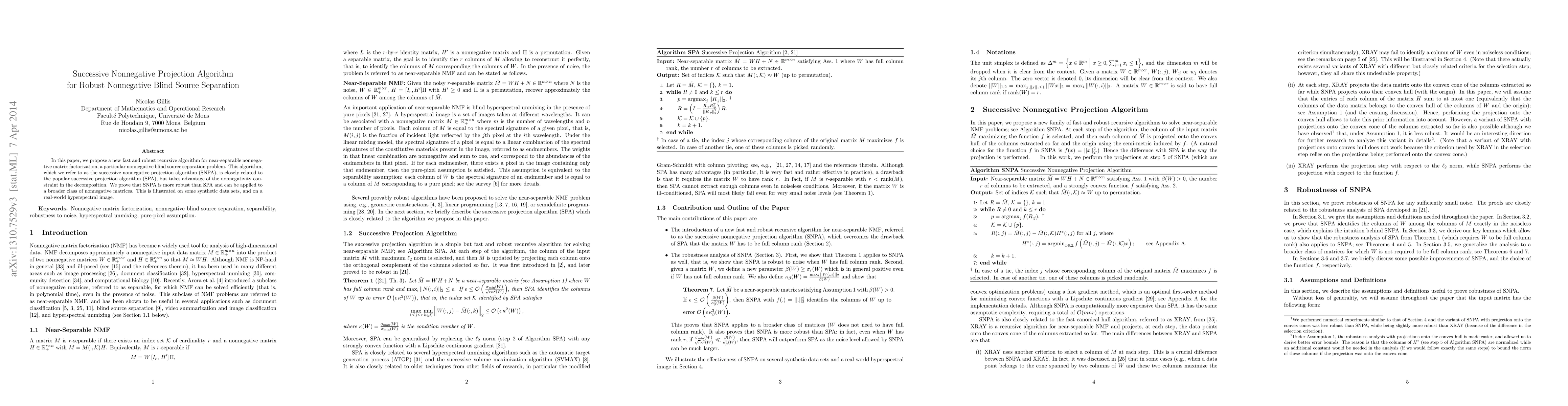 The paper proposes the successive nonnegative projection algorithm (SNPA) for robust nonnegative blind source separation, demonstrating its robustness and broader applicability compared to the successive projection algorithm (SPA). The effectiveness of SNPA is shown through synthetic data and real hyperspectral image data.