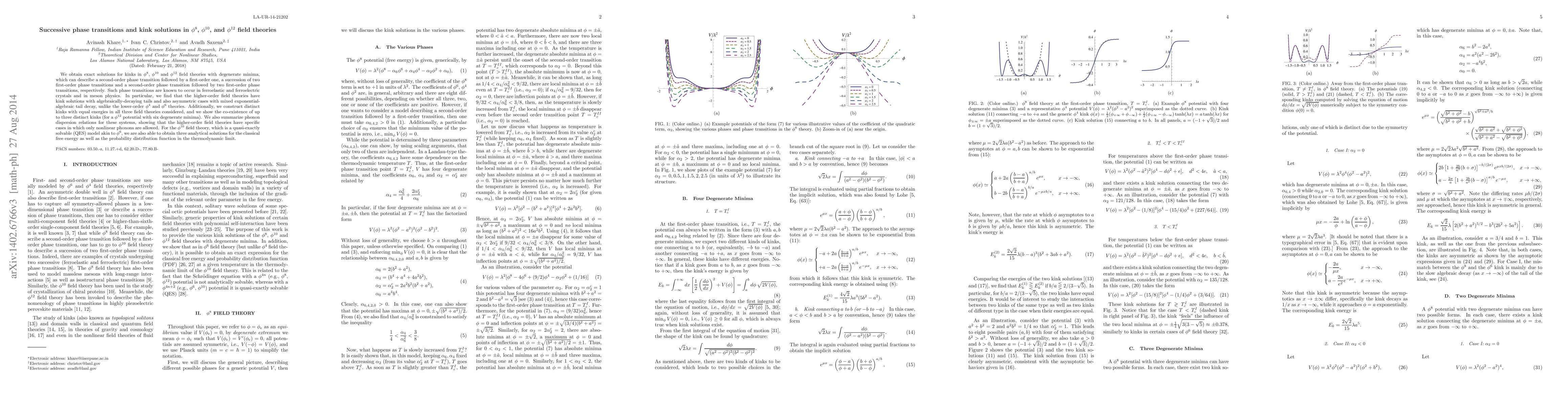 We obtain exact solutions for kinks in $\phi^{8}$, $\phi^{10}$ and $\phi^{12}$ field theories with degenerate minima, which can describe a second-order phase transition followed by a first-order one, a succession of two first-order phase transitions and a second-order phase transition followed by two first-order phase transitions, respectively. Such phase transitions are known to occur in ferroelastic and ferroelectric crystals and in meson physics. In particular, we find that the higher-order field theories have kink solutions with algebraically-decaying tails and also asymmetric cases with mixed exponential-algebraic tail decay, unlike the lower-order $\phi^4$ and $\phi^6$ theories. Additionally, we construct distinct kinks with equal energies in all three field theories considered, and we show the co-existence of up to three distinct kinks (for a $\phi^{12}$ potential with six degenerate minima). We also summarize phonon dispersion relations for these systems, showing that the higher-order field theories have specific cases in which only nonlinear phonons are allowed. For the $\phi^{10}$ field theory, which is a quasi-exactly solvable (QES) model akin to $\phi^6$, we are also able to obtain three analytical solutions for the classical free energy as well as the probability distribution function in the thermodynamic limit.