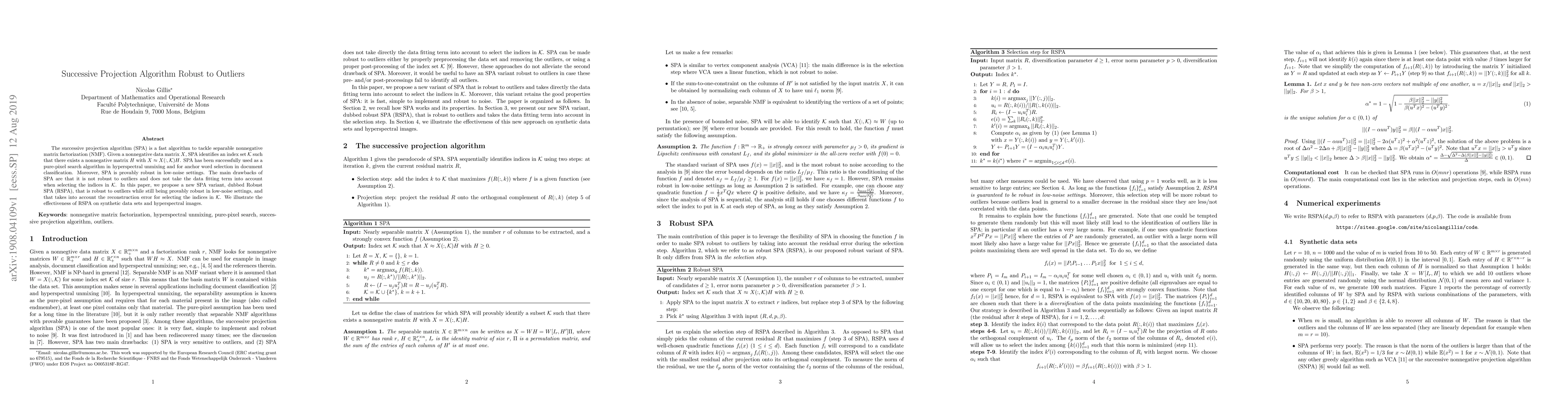 This paper proposes a Robust SPA (RSPA) variant that enhances the successive projection algorithm (SPA) for separable nonnegative matrix factorization by improving its robustness to outliers and incorporating data fitting terms, demonstrating effectiveness on synthetic and hyperspectral datasets.