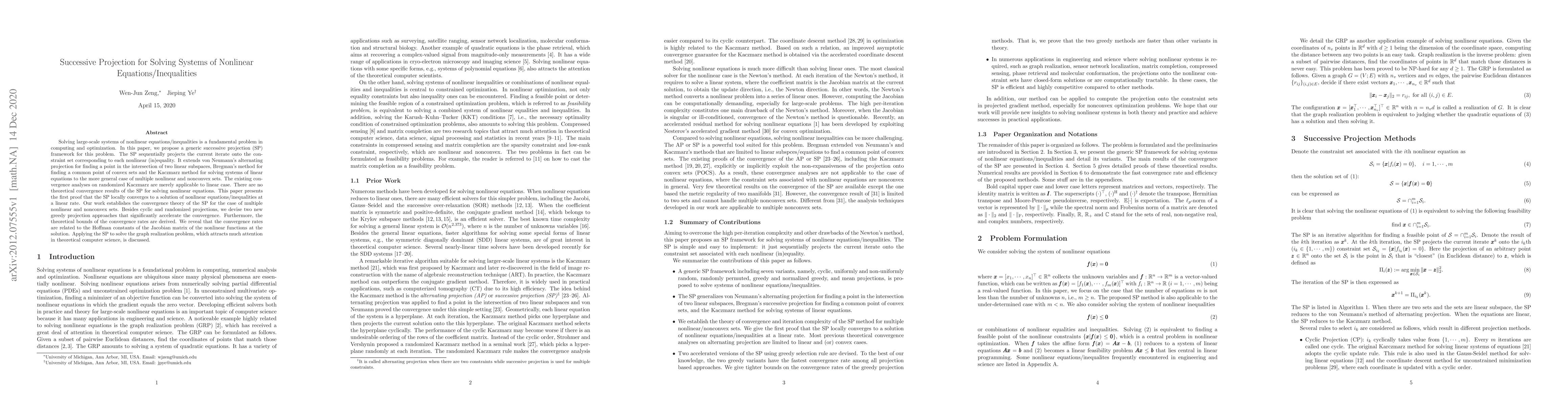 Solving large-scale systems of nonlinear equations/inequalities is a fundamental problem in computing and optimization. In this paper, we propose a generic successive projection (SP) framework for this problem. The SP sequentially projects the current iterate onto the constraint set corresponding to each nonlinear (in)equality. It extends von Neumann's alternating projection for finding a point in the intersection of two linear subspaces, Bregman's method for finding a common point of convex sets and the Kaczmarz method for solving systems of linear equations to the more general case of multiple nonlinear and nonconvex sets. The existing convergence analyses on randomized Kaczmarz are merely applicable to linear case. There are no theoretical convergence results of the SP for solving nonlinear equations. This paper presents the first proof that the SP locally converges to a solution of nonlinear equations/inequalities at a linear rate. Our work establishes the convergence theory of the SP for the case of multiple nonlinear and nonconvex sets. Besides cyclic and randomized projections, we devise two new greedy projection approaches that significantly accelerate the convergence. Furthermore, the theoretical bounds of the convergence rates are derived. We reveal that the convergence rates are related to the Hoffman constants of the Jacobian matrix of the nonlinear functions at the solution. Applying the SP to solve the graph realization problem, which attracts much attention in theoretical computer science, is discussed.