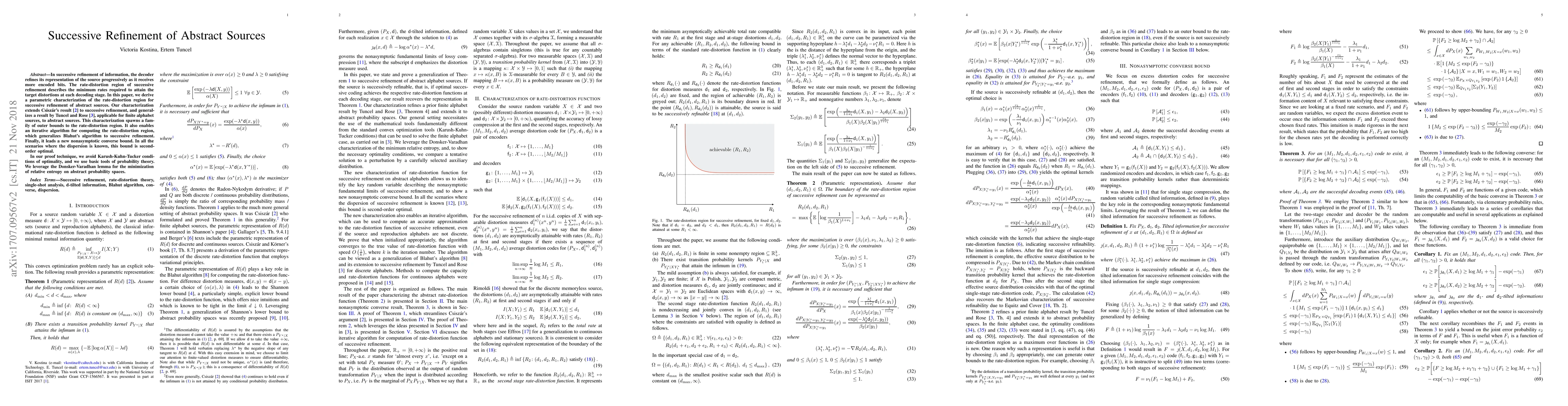 In successive refinement of information, the decoder refines its representation of the source progressively as it receives more encoded bits. The rate-distortion region of successive refinement describes the minimum rates required to attain the target distortions at each decoding stage. In this paper, we derive a parametric characterization of the rate-distortion region for successive refinement of abstract sources. Our characterization extends Csiszar's result to successive refinement, and generalizes a result by Tuncel and Rose, applicable for finite alphabet sources, to abstract sources. This characterization spawns a family of outer bounds to the rate-distortion region. It also enables an iterative algorithm for computing the rate-distortion region, which generalizes Blahut's algorithm to successive refinement. Finally, it leads a new nonasymptotic converse bound. In all the scenarios where the dispersion is known, this bound is second-order optimal. In our proof technique, we avoid Karush-Kuhn-Tucker conditions of optimality, and we use basic tools of probability theory. We leverage the Donsker-Varadhan lemma for the minimization of relative entropy on abstract probability spaces.