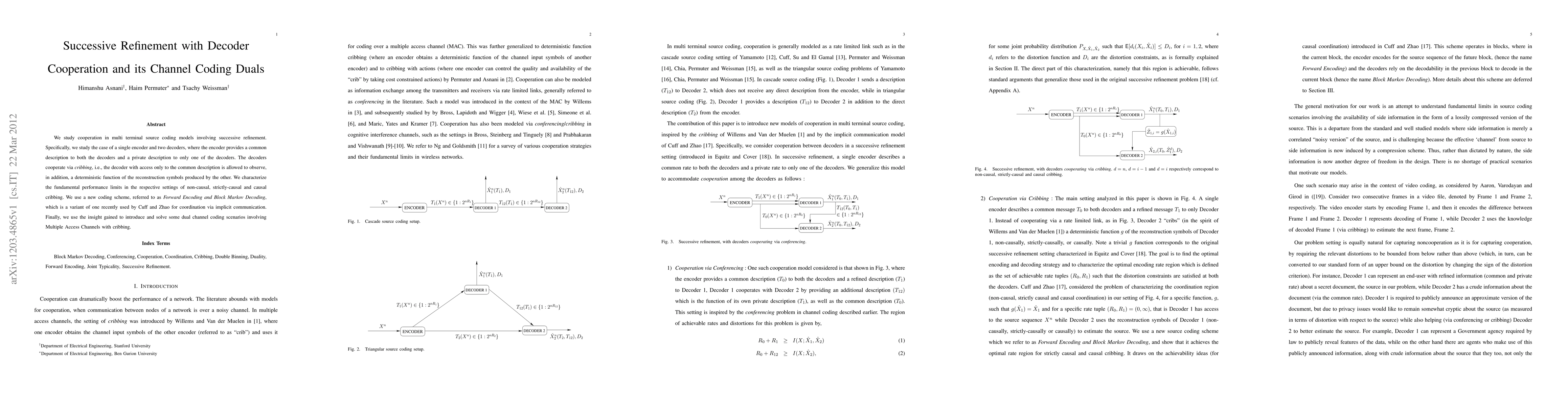 We study cooperation in multi terminal source coding models involving successive refinement. Specifically, we study the case of a single encoder and two decoders, where the encoder provides a common description to both the decoders and a private description to only one of the decoders. The decoders cooperate via cribbing, i.e., the decoder with access only to the common description is allowed to observe, in addition, a deterministic function of the reconstruction symbols produced by the other. We characterize the fundamental performance limits in the respective settings of non-causal, strictly-causal and causal cribbing. We use a new coding scheme, referred to as Forward Encoding and Block Markov Decoding, which is a variant of one recently used by Cuff and Zhao for coordination via implicit communication. Finally, we use the insight gained to introduce and solve some dual channel coding scenarios involving Multiple Access Channels with cribbing.