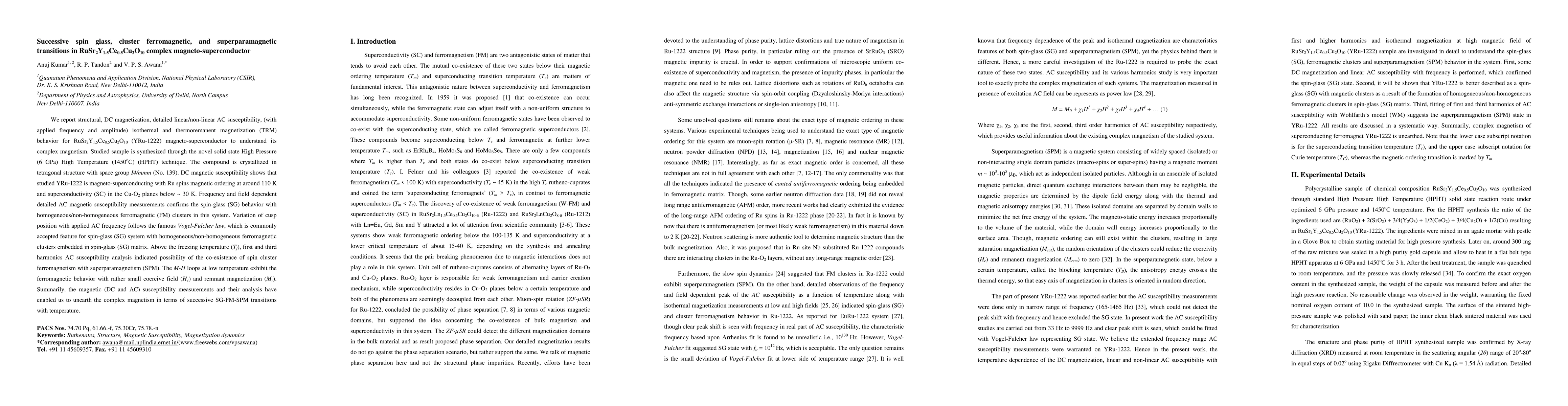 We report structural, DC magnetization, detailed linear/non-linear AC susceptibility, (with applied frequency and amplitude) isothermal and thermoremanent magnetization (TRM) behavior for RuSr2Y1.5Ce0.5Cu2O10 (YRu-1222) magneto-superconductor to understand its complex magnetism. Studied sample is synthesized through the novel solid state High Pressure (6 GPa) High Temperature (1450oC) (HPHT) technique. The compound is crystallized in tetragonal structure with space group I4/mmm (No. 139). DC magnetic susceptibility shows that studied YRu-1222 is magneto-superconducting with Ru spins magnetic ordering at around 110 K and superconductivity (SC) in the Cu-O2 planes below ~ 30 K. Frequency and field dependent detailed AC magnetic susceptibility measurements confirms the spin-glass (SG) behavior with homogeneous/non-homogeneous ferromagnetic (FM) clusters in this system. Variation of cusp position with applied AC frequency follows the famous Vogel-Fulcher law, which is commonly accepted feature for spin-glass (SG) system with homogeneous/non-homogeneous ferromagnetic clusters embedded in spin-glass (SG) matrix. Above the freezing temperature (Tf), first and third harmonics AC susceptibility analysis indicated possibility of the co-existence of spin cluster ferromagnetism with superparamagnetism (SPM). The M-H loops at low temperature exhibit the ferromagnetic behavior with rather small coercive field (Hc) and remnant magnetization (Mr). Summarily, the magnetic (DC and AC) susceptibility measurements and their analysis have enabled us to unearth the complex magnetism in terms of successive SG-FM-SPM transitions with temperature.