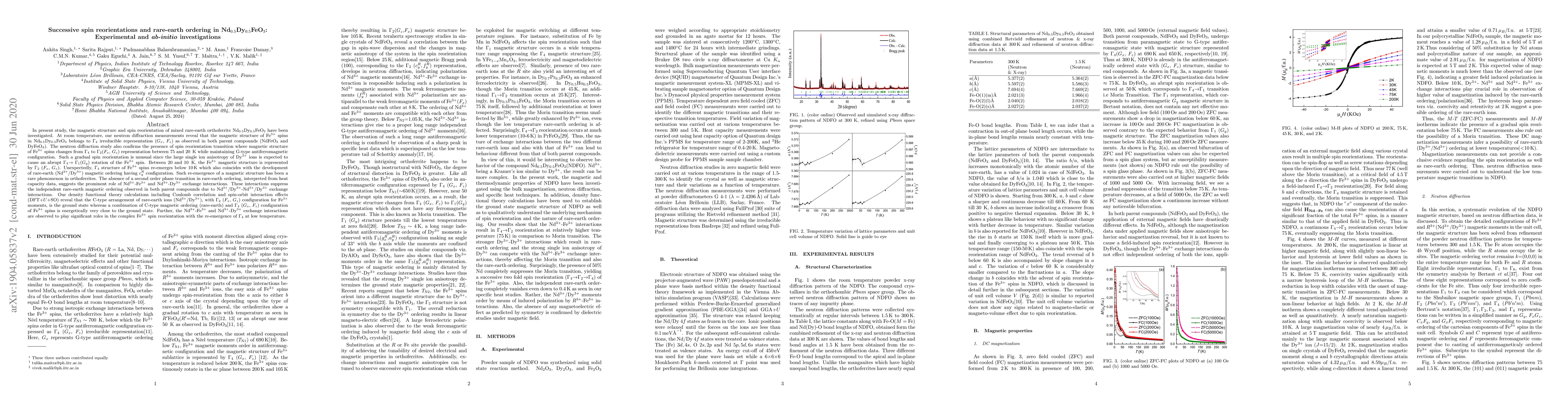 In present study, the magnetic structure and spin reorientation of mixed doped orthoferrite Nd$_{0.5}$Dy$_{0.5}$FeO$_3$ have been investigated. Similar to both parent compounds (NdFeO$_3$ and DyFeO$_3$), the magnetic structure of Fe$^{3+}$ belongs to ${\Gamma}_{4}$ irreducible representation (G$_{x}$, F$_{z}$) at room temperature. The experimental measurements confirmed the spin reorientation where magnetic structure of Fe$^{3+}$ changes from ${\Gamma}_{4}$ to ${\Gamma}_{2}$(F$_{x}$, G$_{z}$) between 75 and 20 \,K while maintaining G-type configuration. Such a gradual spin reorientation is unusual since the large single ion anisotropy of Dy$^{3+}$ ions causes an abrupt ${\Gamma}_{4}$${\rightarrow}$ ${\Gamma}_{1}$(G$_{y}$) spin reorientation in DyFeO$_3$. Between 20 and 10 \,K, the Fe$^{3+}$ magnetic structure is represented by ${\Gamma}_{2}$ (F$_{x}$, G$_{z}$). Unexpectedly, magnetic structure of Fe$^{3+}$ with ${\Gamma}_{4}$ representation re-emerges below 10\,K which also coincides with the development of rare-earth (Nd$^{3+}$/Dy$^{3+}$) magnetic ordering having C$_{y}$ configuration with magnetic moment of 1.8 ${\mu}_{B}$. The absence of any signature of second order phase transition in the specific heat confirms the role of $R$(Nd$^{3+}$/Dy$^{3+}$)-Fe$^{3+}$ exchange interaction in the observed "rare-earth ordering" unlike DyFeO$_3$ where Dy$^{3+}$ ordering takes place independently to the magnetic ordering of Fe$^{3+}$ magnetic structure. Our (DFT+U+SO) calculations show that the C-type arrangement of rare-earth ions (Nd$^{3+}$/Dy$^{3+}$) with ${\Gamma}_{2}$ configuration for Fe$^{3+}$ moments is the ground state whereas ${\Gamma}_{4}$ phase is energetically very close. Nd-Fe and Nd-Dy exchange interactions, estimated from DFT, are observed to have significant roles in the rare earth ordering and Fe spin reorientation corroborating our experimental results.