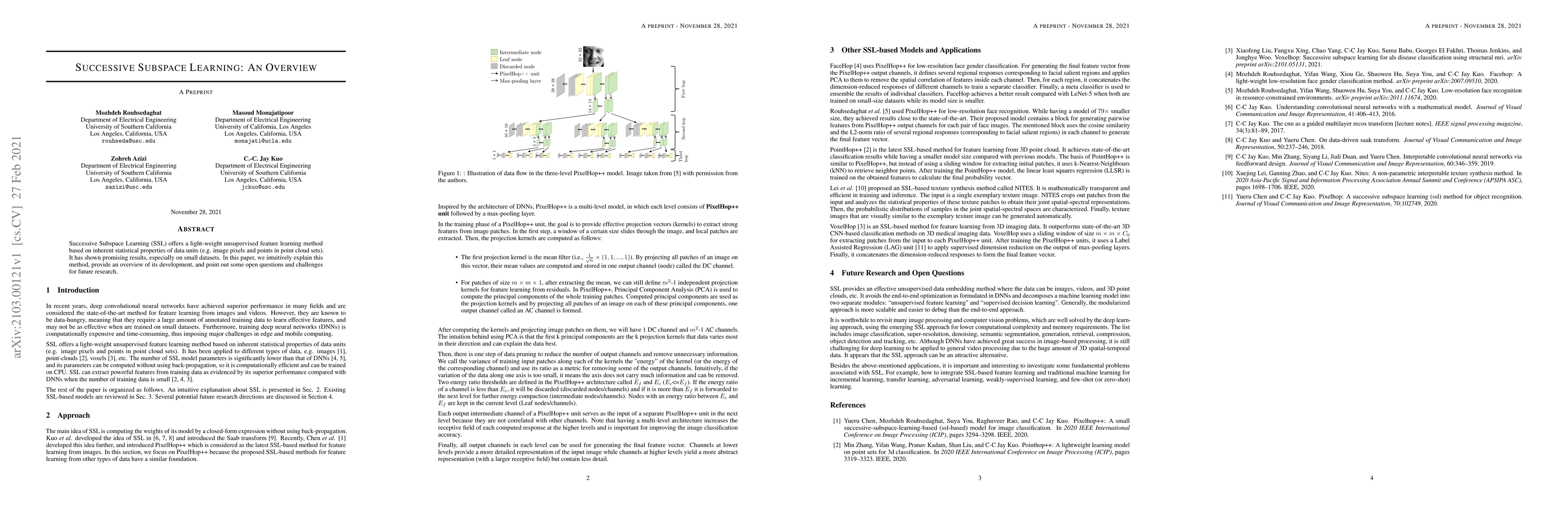 Successive Subspace Learning (SSL) offers a light-weight unsupervised feature learning method based on inherent statistical properties of data units (e.g. image pixels and points in point cloud sets). It has shown promising results, especially on small datasets. In this paper, we intuitively explain this method, provide an overview of its development, and point out some open questions and challenges for future research.