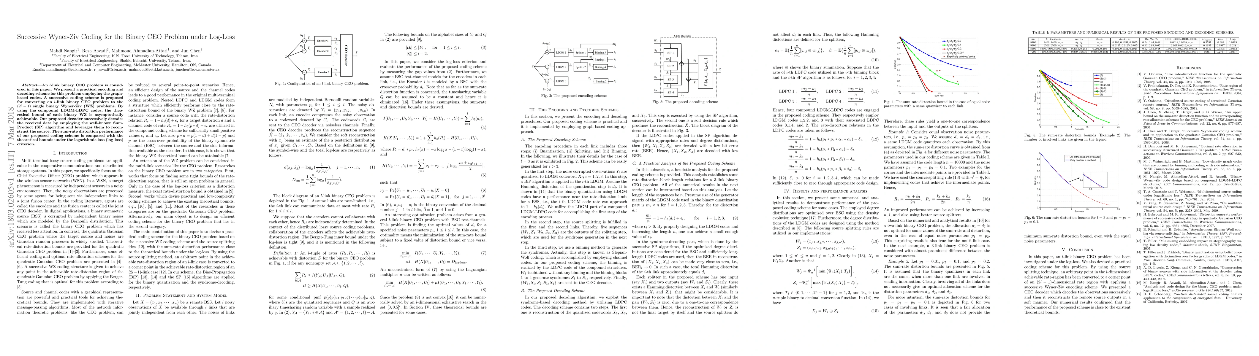 This paper proposes a successive Wyner-Ziv coding scheme for the binary CEO problem using graph-based codes and compound LDGM-LDPC codes. The method converts the l-link problem into (2l-1) single binary Wyner-Ziv problems, achieving theoretical bounds asymptotically under log-loss criterion. The Sum-Product algorithm is used for decoding.