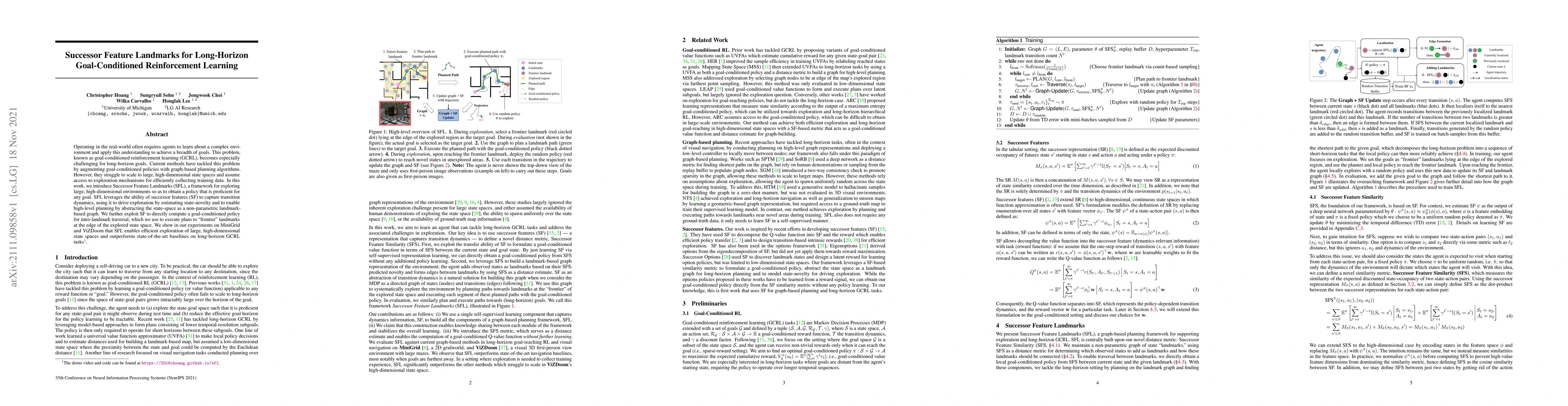 This paper introduces Successor Feature Landmarks (SFL) for long-horizon goal-conditioned reinforcement learning, leveraging successor features to drive exploration and enable high-level planning through a non-parametric landmark-based graph. Experiments demonstrate SFL's efficiency in large, high-dimensional environments and superior performance on long-horizon tasks compared to baselines.