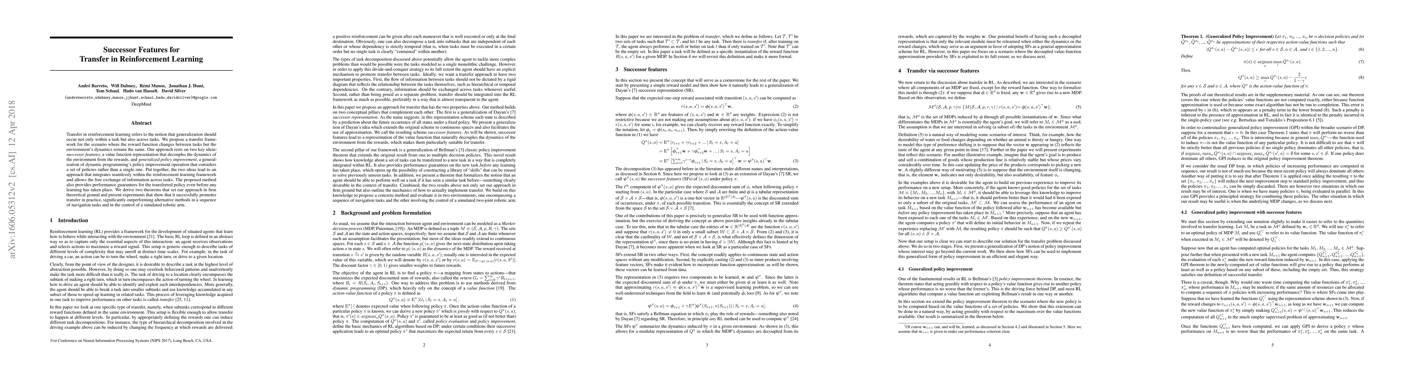 This paper proposes a transfer framework in reinforcement learning that leverages "successor features" and "generalized policy improvement" to facilitate knowledge transfer across tasks with differing reward functions but identical environment dynamics. Theoretical guarantees and experimental results demonstrate its effectiveness in navigation tasks and robotic arm control.
