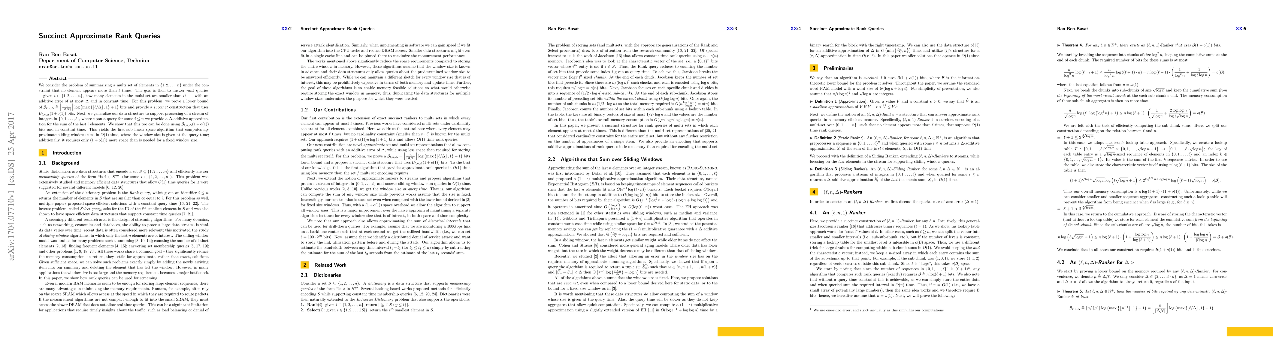 This paper addresses the challenge of efficiently summarizing a multiset of elements under the constraint that no element appears more than $\ell$ times, aiming to answer rank queries with an additive error of at most $\Delta$ in constant time. It presents a succinct data structure using $\mathcal B_{\ell,n,\Delta}(1+o(1))$ bits and extends this to handle streaming data for approximate sliding window sums.