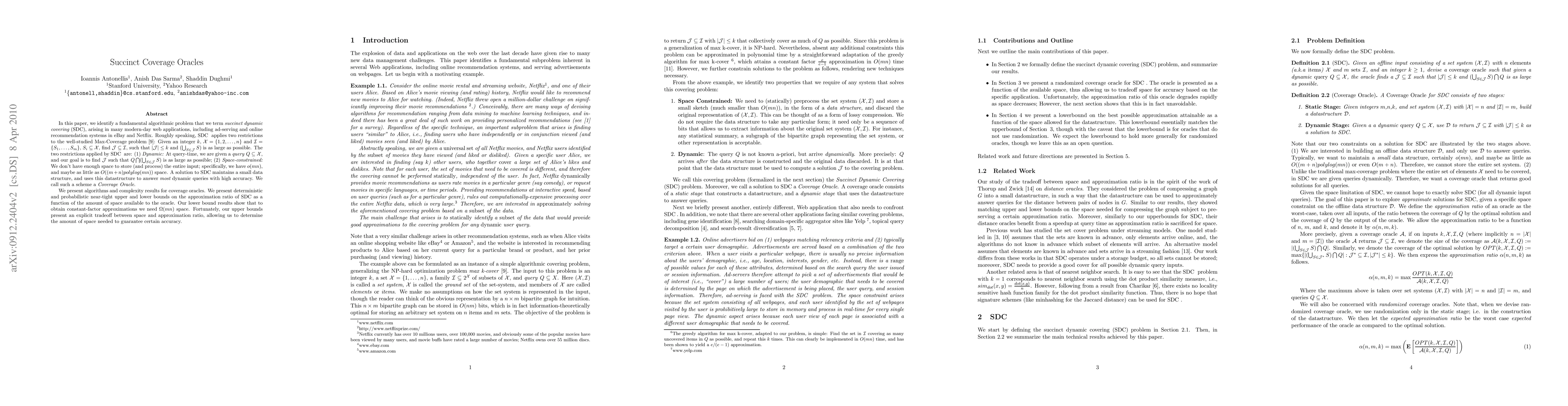 This research introduces Succinct Dynamic Covering (SDC), a problem in web applications like ad-serving and recommendation systems. It presents algorithms and complexity results for Coverage Oracles, offering near-tight upper and lower bounds on approximation ratios based on available space. Constant-factor approximations necessitate Omega(mn) space, while upper bounds show a tradeoff between space and accuracy.