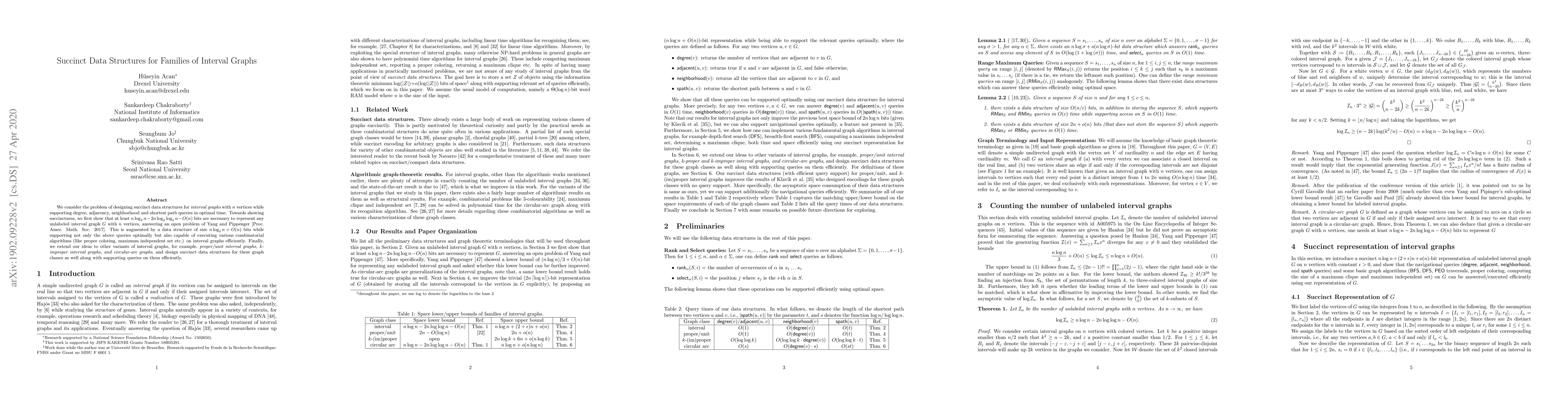 We consider the problem of designing succinct data structures for interval graphs with $n$ vertices while supporting degree, adjacency, neighborhood and shortest path queries in optimal time in the $\Theta(\log n)$-bit word RAM model. The degree query reports the number of incident edges to a given vertex in constant time, the adjacency query returns true if there is an edge between two vertices in constant time, the neighborhood query reports the set of all adjacent vertices in time proportional to the degree of the queried vertex, and the shortest path query returns a shortest path in time proportional to its length, thus the running times of these queries are optimal. Towards showing succinctness, we first show that at least $n\log{n} - 2n\log\log n - O(n)$ bits are necessary to represent any unlabeled interval graph $G$ with $n$ vertices, answering an open problem of Yang and Pippenger [Proc. Amer. Math. Soc. 2017]. This is augmented by a data structure of size $n\log{n} +O(n)$ bits while supporting not only the aforementioned queries optimally but also capable of executing various combinatorial algorithms (like proper coloring, maximum independent set etc.) on the input interval graph efficiently. Finally, we extend our ideas to other variants of interval graphs, for example, proper/unit interval graphs, k-proper and k-improper interval graphs, and circular-arc graphs, and design succinct/compact data structures for these graph classes as well along with supporting queries on them efficiently.