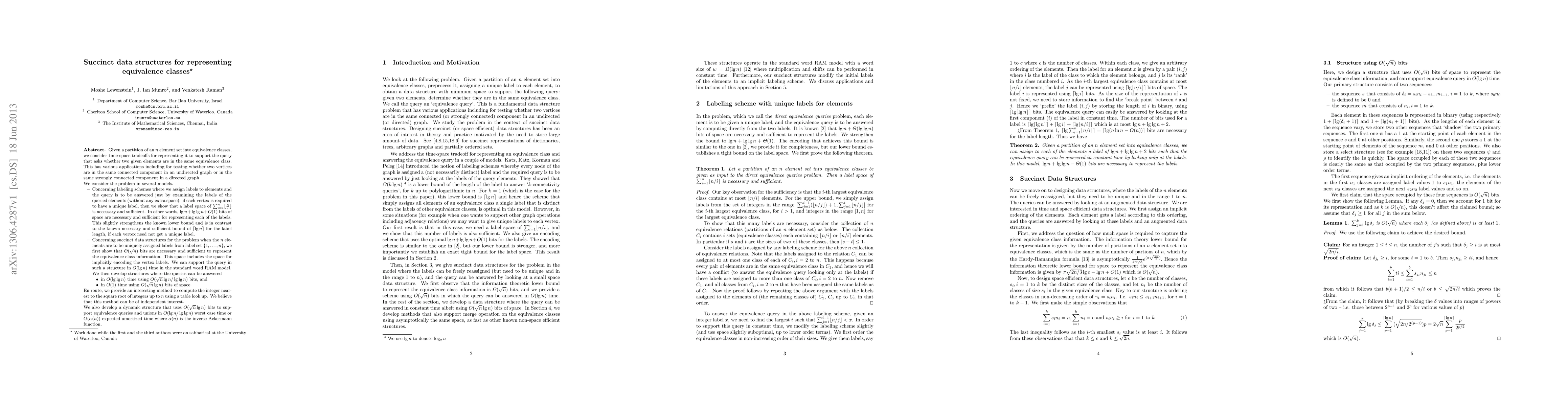 Given a partition of an n element set into equivalence classes, we consider time-space tradeoffs for representing it to support the query that asks whether two given elements are in the same equivalence class. This has various applications including for testing whether two vertices are in the same component in an undirected graph or in the same strongly connected component in a directed graph. We consider the problem in several models. -- Concerning labeling schemes where we assign labels to elements and the query is to be answered just by examining the labels of the queried elements (without any extra space): if each vertex is required to have a unique label, then we show that a label space of (\sum_{i=1}^n \lfloor {n \over i} \rfloor) is necessary and sufficient. In other words, \lg n + \lg \lg n + O(1) bits of space are necessary and sufficient for representing each of the labels. This slightly strengthens the known lower bound and is in contrast to the known necessary and sufficient bound of \lceil \lg n \rceil for the label length, if each vertex need not get a unique label. --Concerning succinct data structures for the problem when the n elements are to be uniquely assigned labels from label set {1, 2, ...n}, we first show that \Theta(\sqrt n) bits are necessary and sufficient to represent the equivalence class information. This space includes the space for implicitly encoding the vertex labels. We can support the query in such a structure in O(\lg n) time in the standard word RAM model. We then develop structures resulting in one where the queries can be supported in constant time using O({\sqrt n} \lg n) bits of space. We also develop space efficient structures where union operation along with the equivalence query can be answered fast.