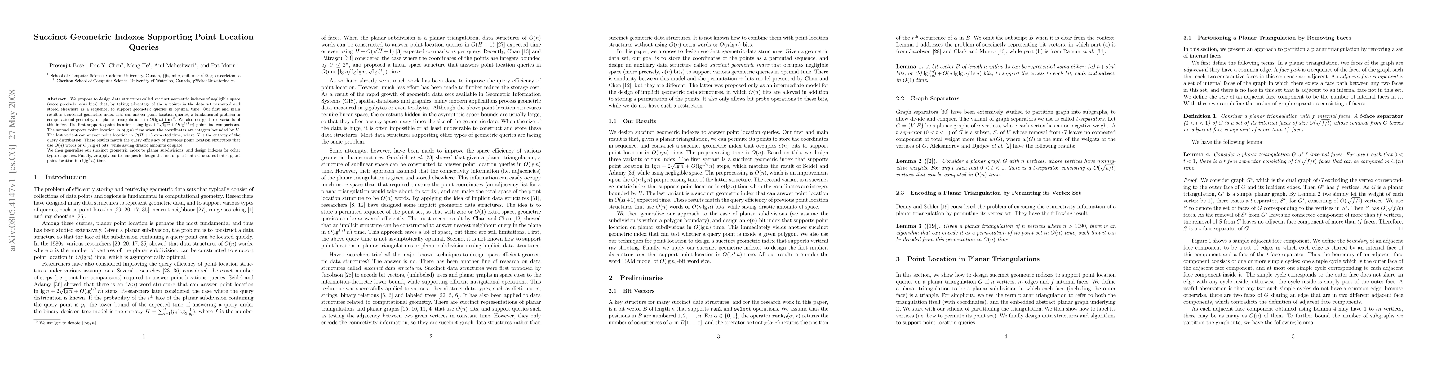 This paper introduces succinct geometric indexes that use o(n) bits to support point location queries on planar triangulations in O(lg n) time, achieving optimal query efficiency while drastically reducing space compared to previous methods. The authors also generalize their index to planar subdivisions and design implicit data structures for faster point location.