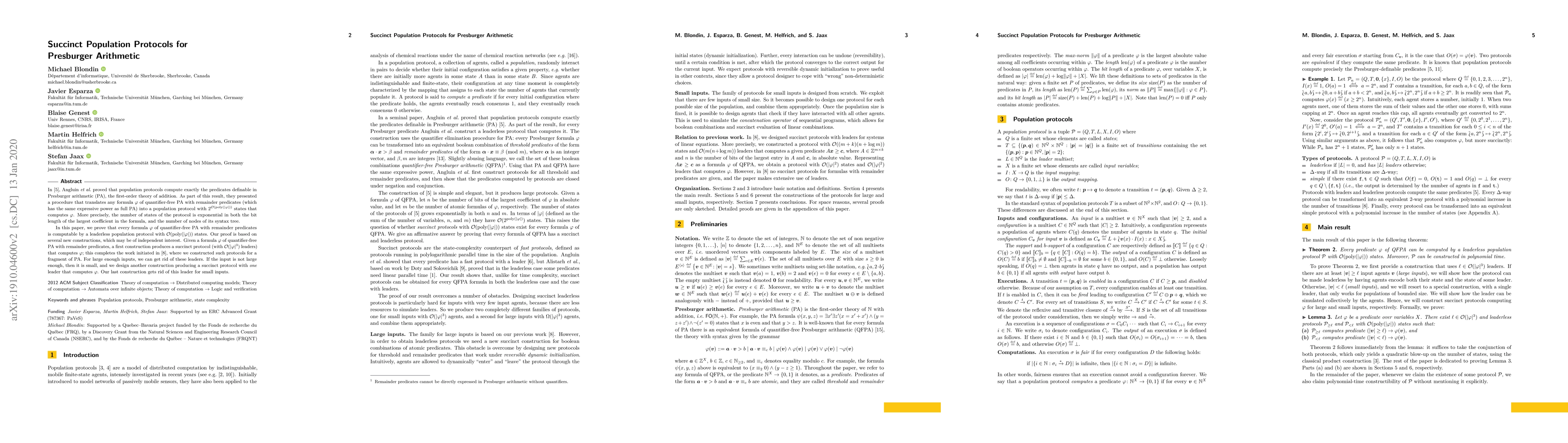 Angluin et al. proved that population protocols compute exactly the predicates definable in Presburger arithmetic (PA), the first-order theory of addition. As part of this result, they presented a procedure that translates any formula $\varphi$ of quantifier-free PA with remainder predicates (which has the same expressive power as full PA) into a population protocol with $2^{O(\text{poly}(|\varphi|))}$ states that computes $\varphi$. More precisely, the number of states of the protocol is exponential in both the bit length of the largest coefficient in the formula, and the number of nodes of its syntax tree. In this paper, we prove that every formula $\varphi$ of quantifier-free PA with remainder predicates is computable by a leaderless population protocol with $O(\text{poly}(|\varphi|))$ states. Our proof is based on several new constructions, which may be of independent interest. Given a formula $\varphi$ of quantifier-free PA with remainder predicates, a first construction produces a succinct protocol (with $O(|\varphi|^3)$ leaders) that computes $\varphi$; this completes the work initiated in [STACS'18], where we constructed such protocols for a fragment of PA. For large enough inputs, we can get rid of these leaders. If the input is not large enough, then it is small, and we design another construction producing a succinct protocol with one leader that computes $\varphi$. Our last construction gets rid of this leader for small inputs.