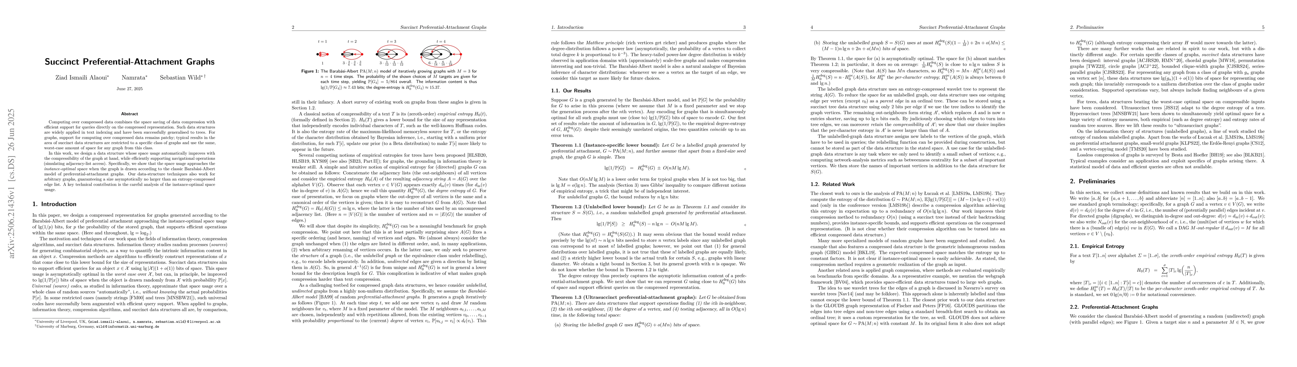 The paper develops a data structure that compresses preferential attachment graphs by leveraging entropy-based measures and tree-based representations, supporting efficient navigational queries.