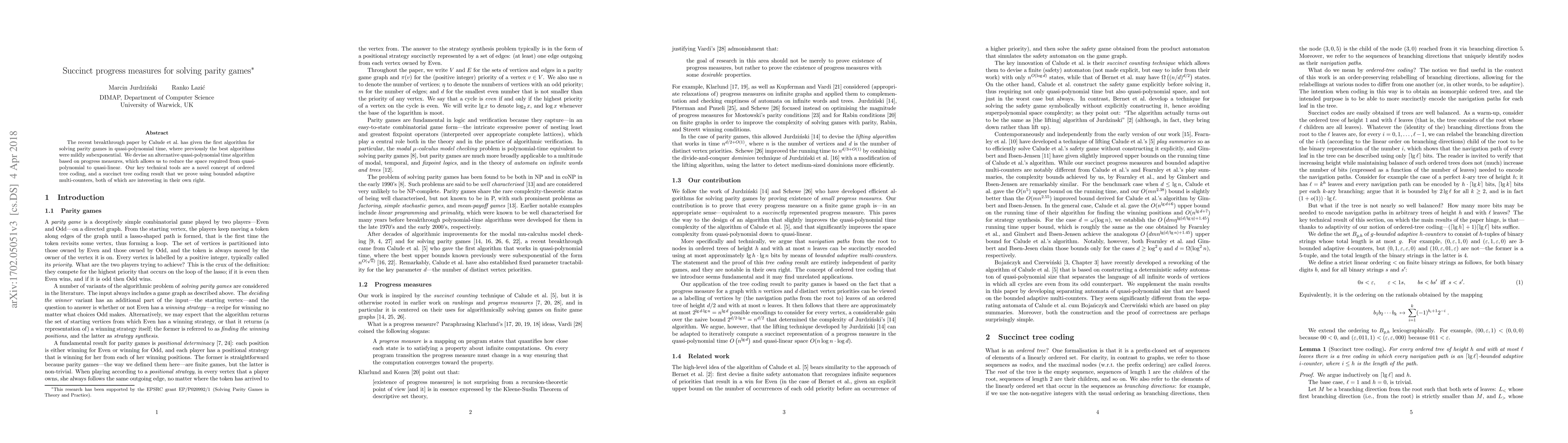 The recent breakthrough paper by Calude et al. has given the first algorithm for solving parity games in quasi-polynomial time, where previously the best algorithms were mildly subexponential. We devise an alternative quasi-polynomial time algorithm based on progress measures, which allows us to reduce the space required from quasi-polynomial to nearly linear. Our key technical tools are a novel concept of ordered tree coding, and a succinct tree coding result that we prove using bounded adaptive multi-counters, both of which are interesting in their own right.