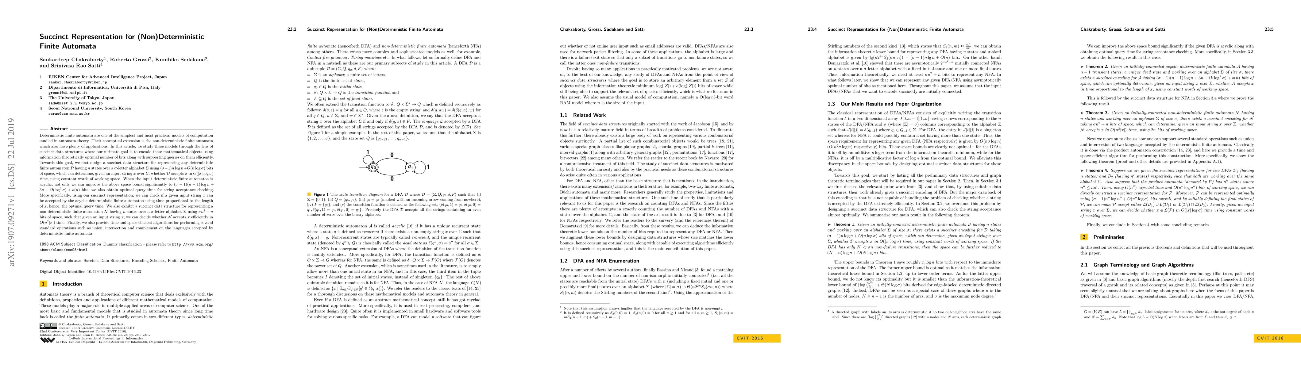 This paper presents succinct data structures for representing deterministic and non-deterministic finite automata, aiming to use the minimum number of bits while supporting efficient query operations. It achieves optimal space and query time for acyclic deterministic finite automata and provides efficient algorithms for standard operations on these automata.