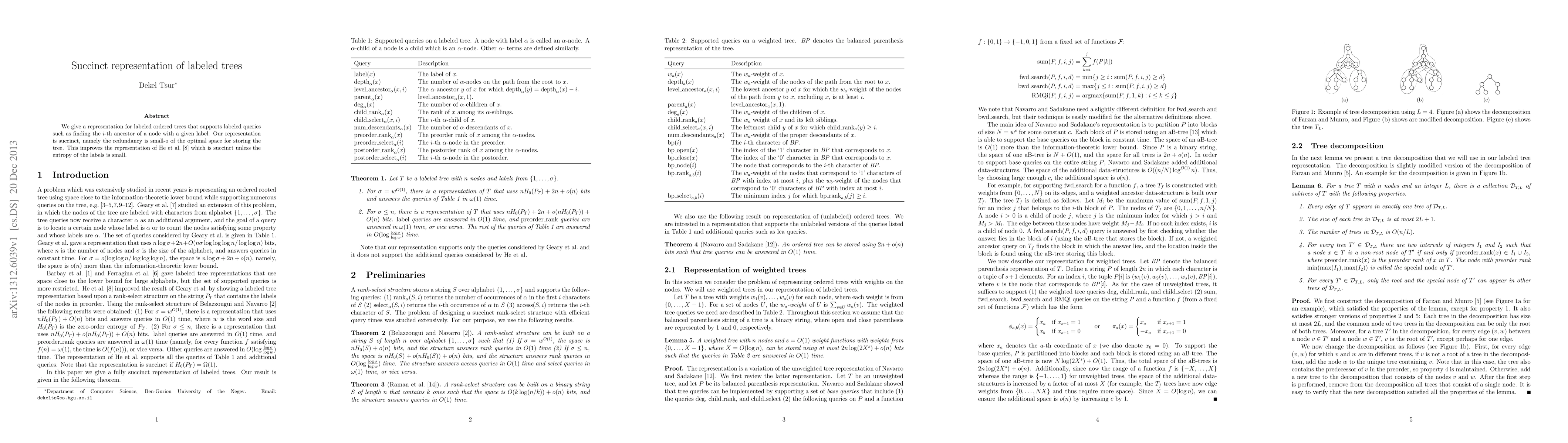 The paper presents a succinct representation for labeled ordered trees using balanced parenthesis representation and AVL trees, supporting queries like finding the i-th ancestor of a node with a given label.