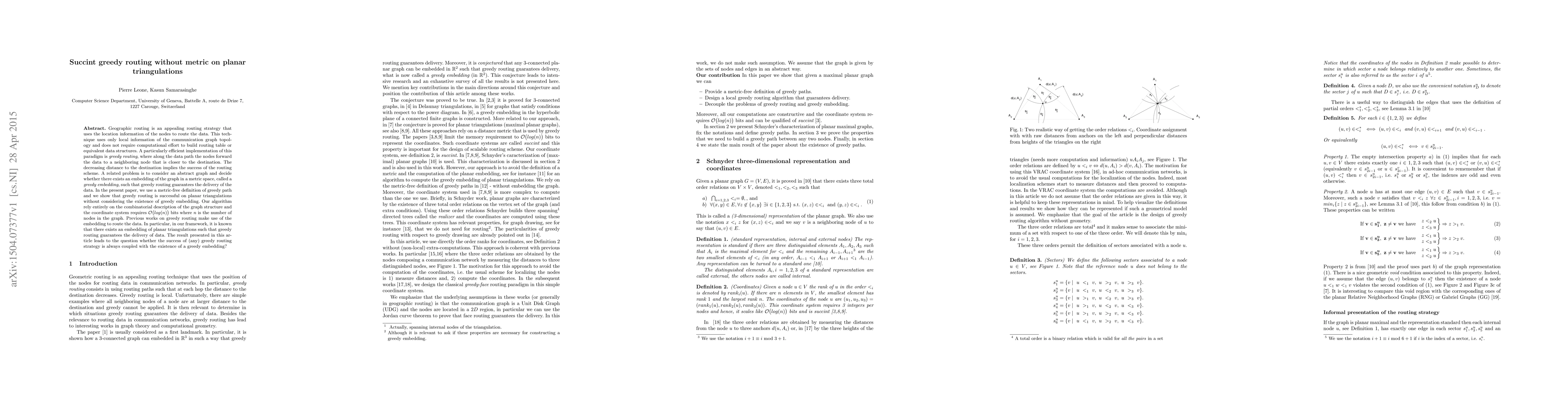 Geographic routing is an appealing routing strategy that uses the location information of the nodes to route the data. This technique uses only local information of the communication graph topology and does not require computational effort to build routing table or equivalent data structures. A particularly efficient implementation of this paradigm is greedy routing, where along the data path the nodes forward the data to a neighboring node that is closer to the destination. The decreasing distance to the destination implies the success of the routing scheme. A related problem is to consider an abstract graph and decide whether there exists an embedding of the graph in a metric space, called a greedy embedding, such that greedy routing guarantees the delivery of the data. In the present paper, we use a metric-free definition of greedy path and we show that greedy routing is successful on planar triangulations without considering the existence of greedy embedding. Our algorithm rely entirely on the combinatorial description of the graph structure and the coordinate system requires O(log(n)) bits where n is the number of nodes in the graph. Previous works on greedy routing make use of the embedding to route the data. In particular, in our framework, it is known that there exists an embedding of planar triangulations such that greedy routing guarantees the delivery of data. The result presented in this article leads to the question whether the success of (any) greedy routing strategy is always coupled with the existence of a greedy embedding?