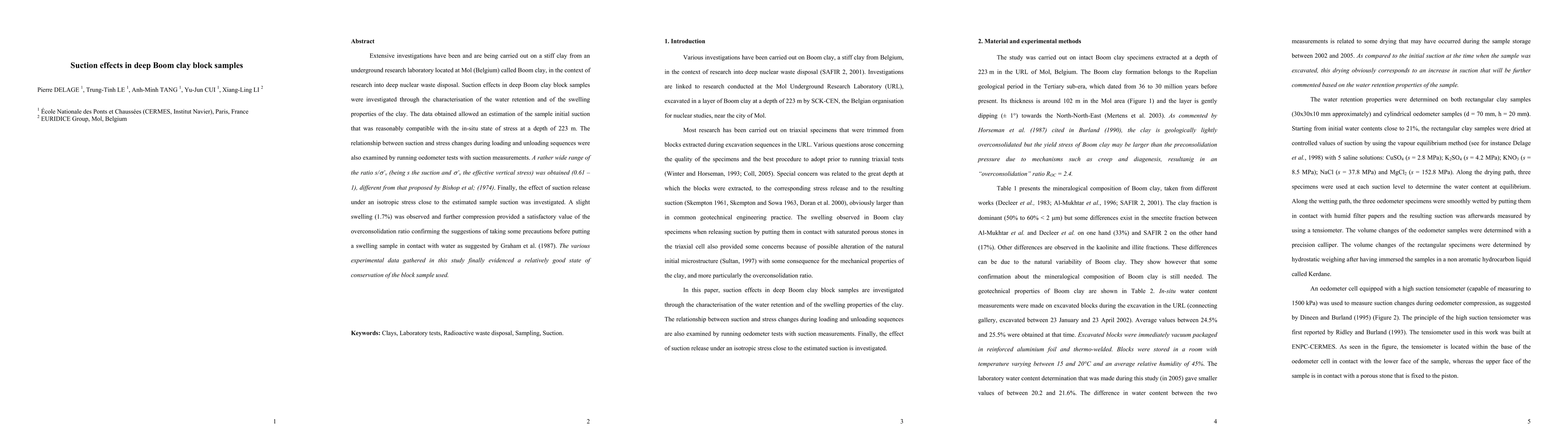 Extensive investigations have been and are being carried out on a stiff clay from an underground research laboratory located at Mol (Belgium) called Boom clay, in the context of research into deep nuclear waste disposal. Suction effects in deep Boom clay block samples were investigated through the characterisation of the water retention and of the swelling properties of the clay. The data obtained allowed an estimation of the sample initial suction that was reasonably compatible with the in-situ state of stress at a depth of 223 m. The relationship between suction and stress changes during loading and unloading sequences were also examined by running oedometer tests with suction measurements. A rather wide range of the ratio s/sigma 'v (being s the suction and sigma 'v the effective vertical stress) was obtained (0.61 - 1), different from that proposed by Bishop et al; (1974). Finally, the effect of suction release under an isotropic stress close to the estimated sample suction was investigated. A slight swelling (1.7%) was observed and further compression provided a satisfactory value of the overconsolidation ratio confirming the suggestions of taking some precautions before putting a swelling sample in contact with water as suggested by Graham et al. (1987). The various experimental data gathered in this study finally evidenced a relatively good state of conservation of the block sample used.