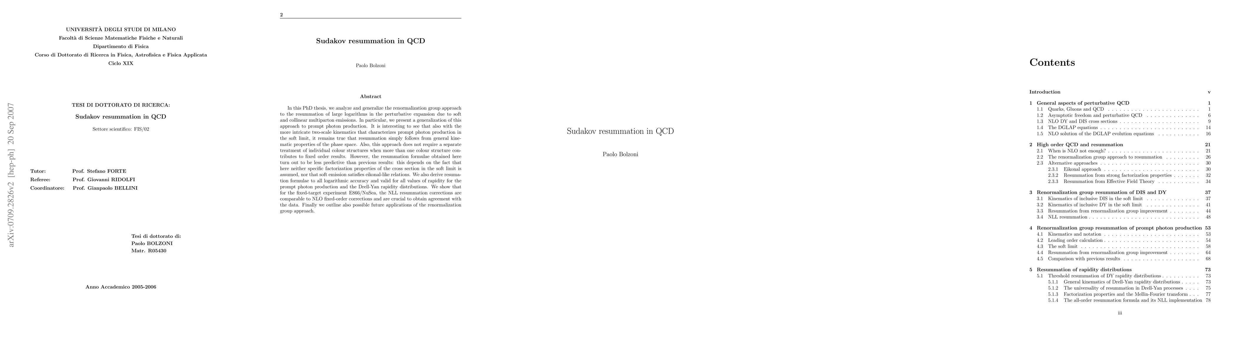 In this PhD thesis, we analyze and generalize the renormalization group approach to the resummation of large logarithms in the perturbative expansion due to soft and collinear multiparton emissions. In particular, we present a generalization of this approach to prompt photon production. It is interesting to see that also with the more intricate two-scale kinematics that characterizes prompt photon production in the soft limit, it remains true that resummation simply follows from general kinematic properties of the phase space. Also, this approach does not require a separate treatment of individual colour structures when more than one colour structure contributes to fixed order results. However, the resummation formulae obtained here turn out to be less predictive than previous results: this depends on the fact that here neither specific factorization properties of the cross section in the soft limit is assumed, nor that soft emission satisfies eikonal-like relations. We also derive resumation formulae to all logarithmic accuracy and valid for all values of rapidity for the prompt photon production and the Drell-Yan rapidity distributions. We show that for the fixed-target experiment E866/NuSea, the NLL resummation corrections are comparable to NLO fixed-order corrections and are crucial to obtain agreement with the data. Finally we outline also possible future applications of the renormalization group approach.