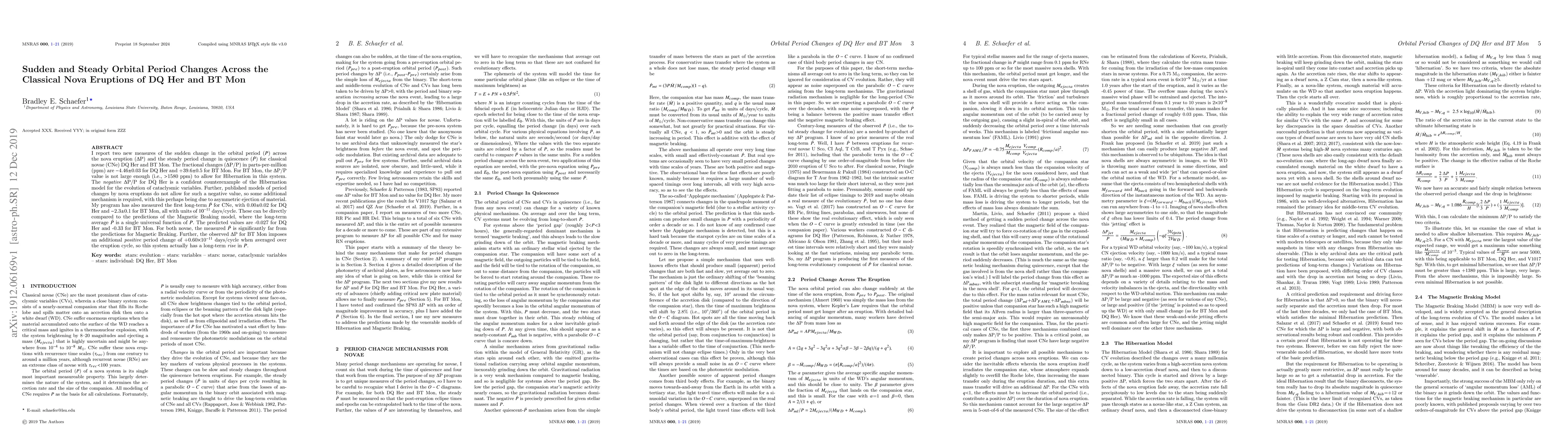 I report two new measures of the sudden change in the orbital period ($P$) across the nova eruption ($\Delta$P) and the steady period change in quiescence ($\dot{P}$) for classical novae (CNe) DQ Her and BT Mon. The fractional changes ($\Delta$P/P) in parts-per-million (ppm) are $-$4.46$\pm$0.03 for DQ Her and +39.6$\pm$0.5 for BT Mon. For BT Mon, the $\Delta$P/P value is not large enough (i.e., $>$1580 ppm) to allow for Hibernation in this system. The {\it negative} $\Delta$P/P for DQ Her is a confident counterexample of the Hibernation model for the evolution of cataclysmic variables. Further, published models of period changes by nova eruptions do not allow for such a negative value, so some additional mechanism is required, with this perhaps being due to asymmetric ejection of material. My program has also measured the first long-term $\dot{P}$ for CNe, with 0.00$\pm$0.02 for DQ Her and $-$2.3$\pm$0.1 for BT Mon, all with units of $10^{-11}$ days/cycle. These can be directly compared to the predictions of the Magnetic Braking model, where the long-term average $\dot{P}$ is a single universal function of $P$. The predicted values are -0.027 for DQ Her and -0.33 for BT Mon. For both novae, the measured $\dot{P}$ is significantly far from the predictions for Magnetic Braking. Further, the observed $\Delta$P for BT Mon imposes an additional {\it positive} period change of +0.60$\times$10$^{-11}$ days/cycle when averaged over the eruption cycle, so this system actually has a long-term {\it rise} in $P$.