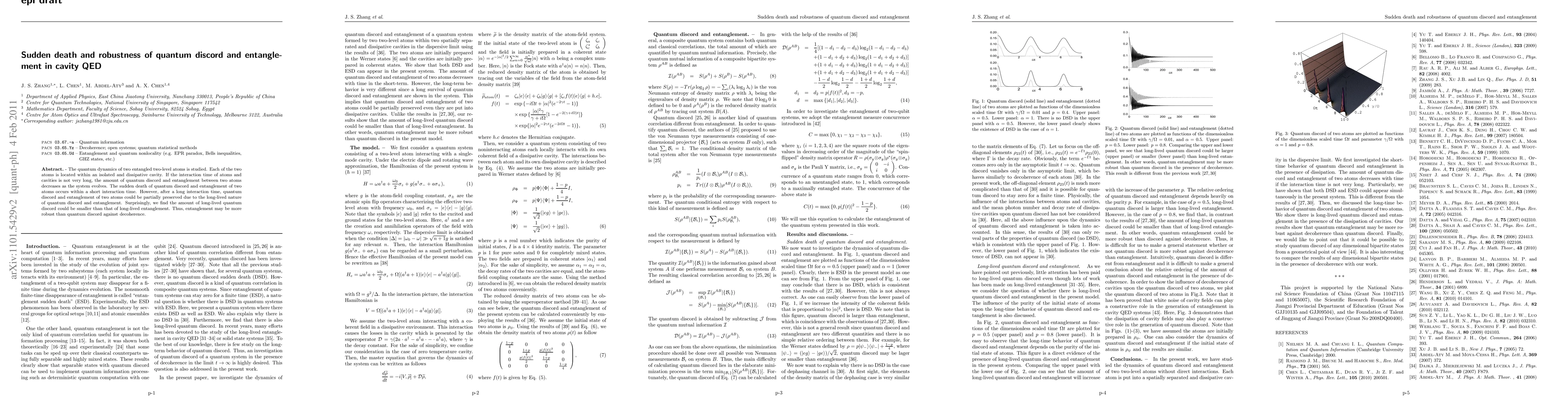 This paper investigates the dynamics of quantum discord and entanglement in two entangled two-level atoms in dissipative cavities, finding that both can experience sudden death within short interaction times. However, long-lived quantum discord and entanglement may persist, with entanglement proving more robust than quantum discord against decoherence.