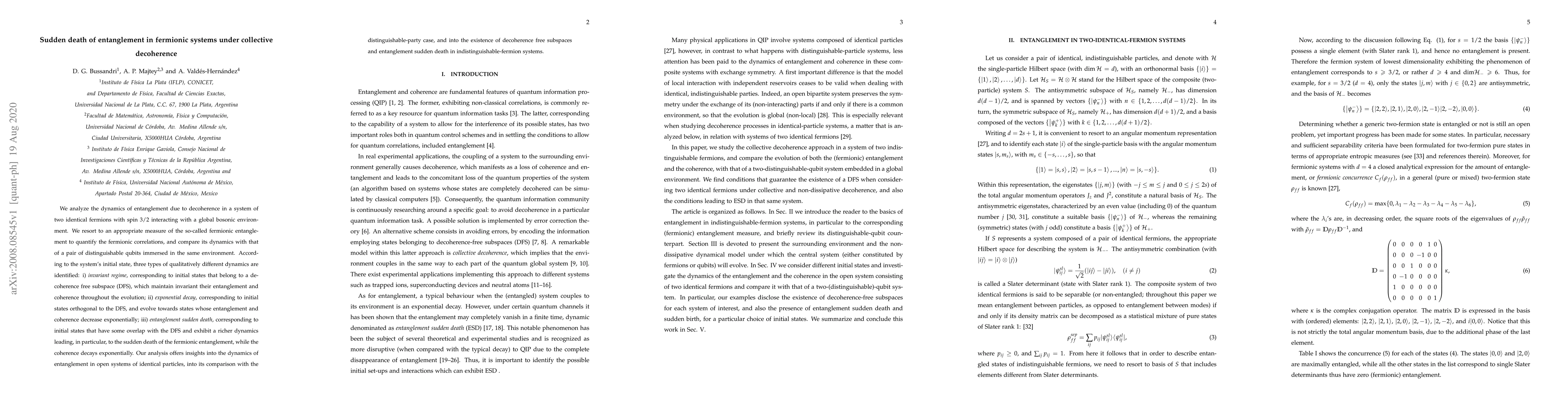 This paper investigates the dynamics of entanglement in a system of two spin-$3/2$ fermions under collective decoherence, identifying three distinct regimes: invariant, exponential decay, and entanglement sudden death, and compares these dynamics to those of distinguishable qubits. The study reveals insights into the behavior of entanglement in fermionic systems and the role of decoherence-free subspaces.