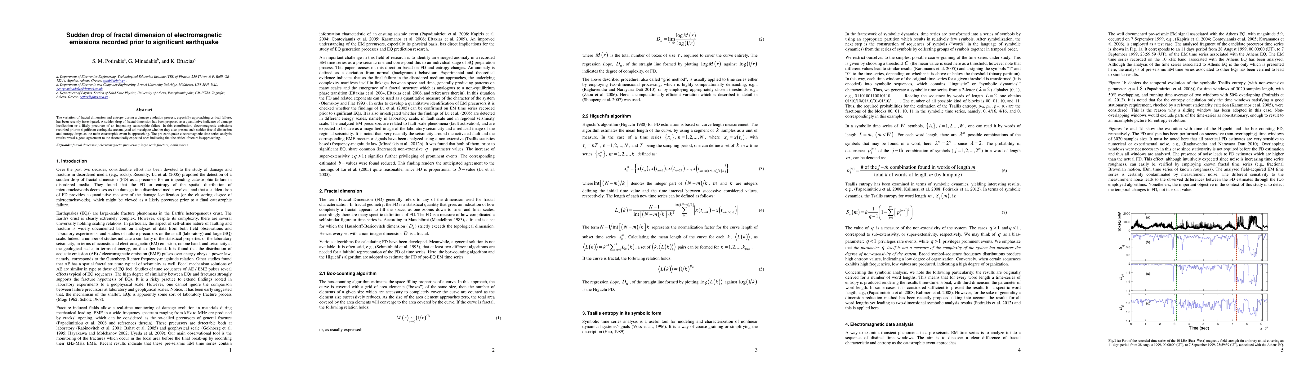 The variation of fractal dimension and entropy during a damage evolution process, especially approaching critical failure, has been recently investigated. A sudden drop of fractal dimension has been proposed as a quantitative indicator of damage localization or a likely precursor of an impending catastrophic failure. In this contribution, electromagnetic emissions recorded prior to significant earthquake are analysed to investigate whether they also present such sudden fractal dimension and entropy drops as the main catastrophic event is approaching. The pre-earthquake electromagnetic time series analysis results reveal a good agreement to the theoretically expected ones indicating that the critical fracture is approaching.