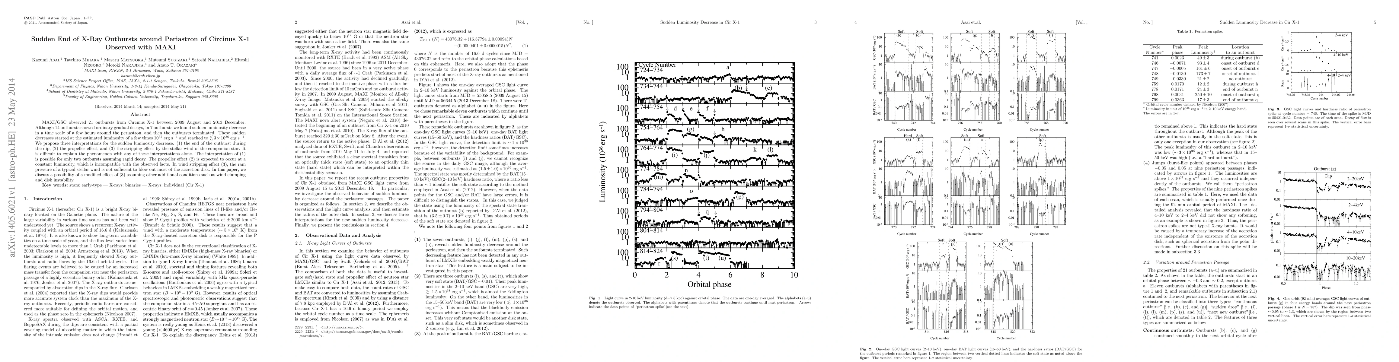 MAXI/GSC observed 21 outbursts from Circinus X-1 between 2009 August and 2013 December. Although 14 outbursts showed ordinary gradual decays, in 7 outbursts we found sudden luminosity decrease in a time scale of a few hours around the periastron, and then the outbursts terminated. These sudden decreases started at the estimated luminosity of a few times $10^{37}$ erg s$^{-1}$ and reached to $\lesssim3\times10^{36}$ erg s$^{-1}$. We propose three interpretations for the sudden luminosity decrease: (1) the end of the outburst during the dip, (2) the propeller effect, and (3) the stripping effect by the stellar wind of the companion star. It is difficult to explain the phenomenon with any of these interpretations alone. The interpretation of (1) is possible for only two outbursts assuming rapid decay. The propeller effect (2) is expected to occur at a constant luminosity, which is incompatible with the observed facts. In wind stripping effect (3), the ram pressure of a typical stellar wind is not sufficient to blow out most of the accretion disk. In this paper, we discuss a possibility of a modified effect of (3) assuming other additional conditions such as wind clumping and disk instability.