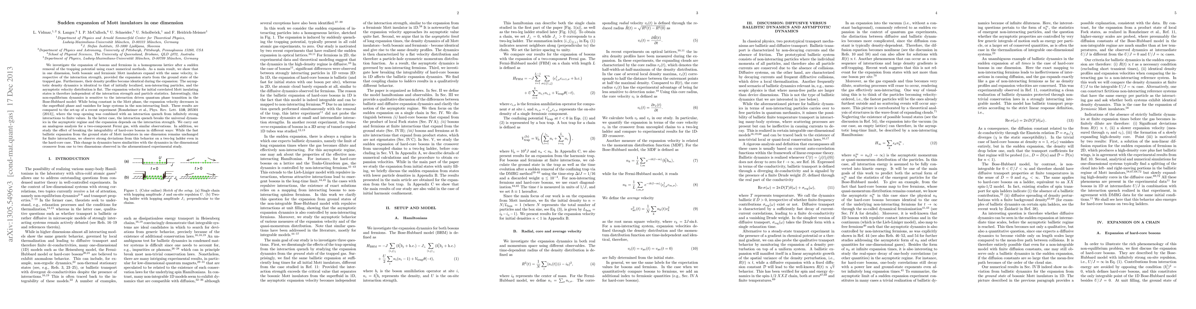 This paper investigates the sudden expansion of bosons and fermions in a one-dimensional lattice after the removal of a trapping potential, revealing that both types of Mott insulators expand with identical velocity and density profiles, independent of interaction strength. The dynamics are sensitive to the quantum phase transition, with expansion velocity decreasing in the superfluid phase and vanishing in the non-interacting limit.