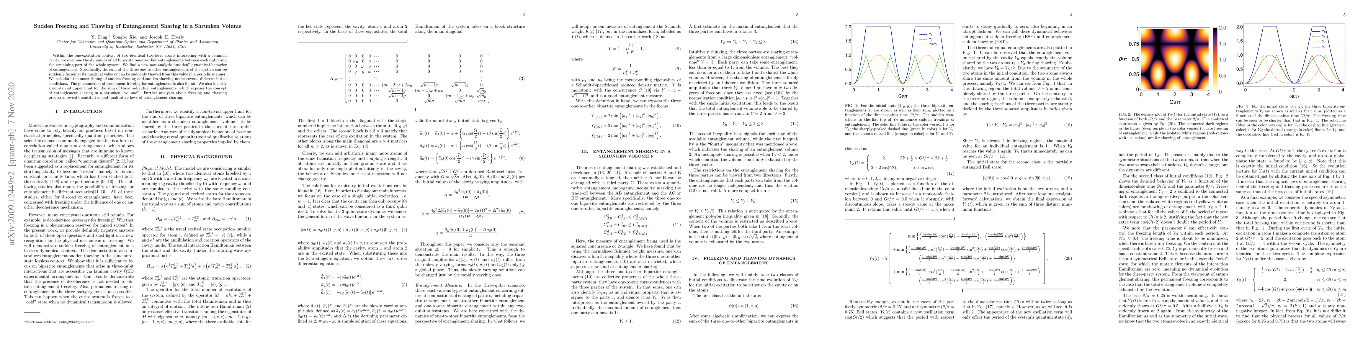 This paper explores the dynamics of entanglement sharing in a system of two identical two-level atoms interacting with a common cavity, revealing sudden freezing and thawing of entanglement in a shrunken volume. The study identifies a non-analytic behavior where the sum of entanglements can abruptly halt or resume at maximal values, with permanent freezing also observed.