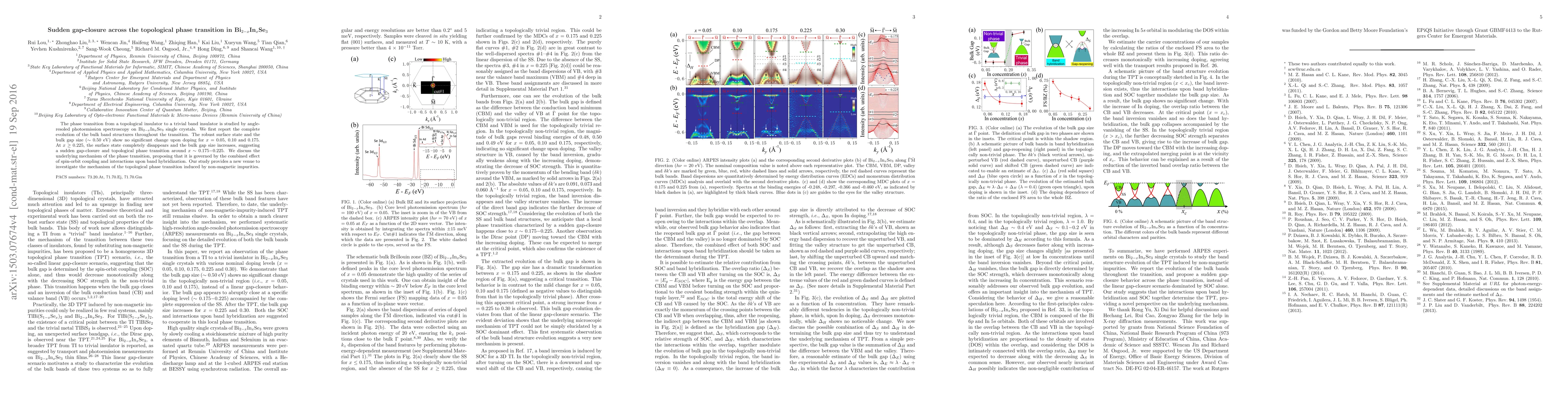 Researchers studied a semiconductor material Bi$_{2-x}$In$_{x}$Se$_{3}$ to understand its topological phase transition when doped with impurities. They found that the surface state disappears and the bulk gap size increases at a specific doping level, suggesting a sudden gap-closure.