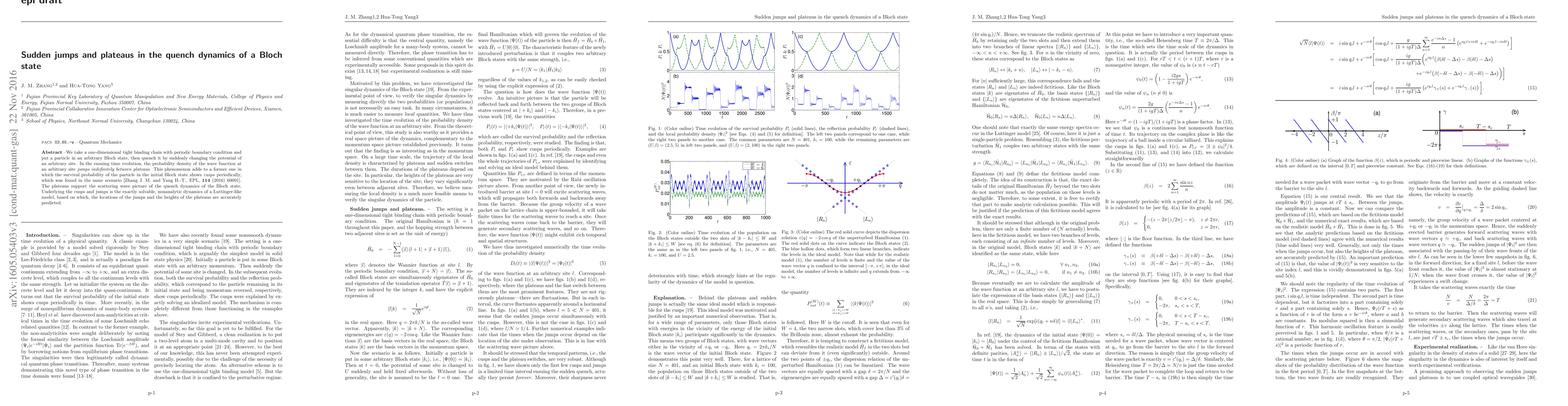 We take a one-dimensional tight binding chain with periodic boundary condition and put a particle in an arbitrary Bloch state, then quench it by suddenly changing the potential of an arbitrary site. In the ensuing time evolution, the probability density of the wave function at an arbitrary site \emph{jumps indefinitely between plateaus}. This phenomenon adds to a former one in which the survival probability of the particle in the initial Bloch state shows \emph{cusps} periodically, which was found in the same scenario [Zhang J. M. and Yang H.-T., EPL, \textbf{114} (2016) 60001]. The plateaus support the scattering wave picture of the quench dynamics of the Bloch state. Underlying the cusps and jumps is the exactly solvable, nonanalytic dynamics of a Luttinger-like model, based on which, the locations of the jumps and the heights of the plateaus are accurately predicted.