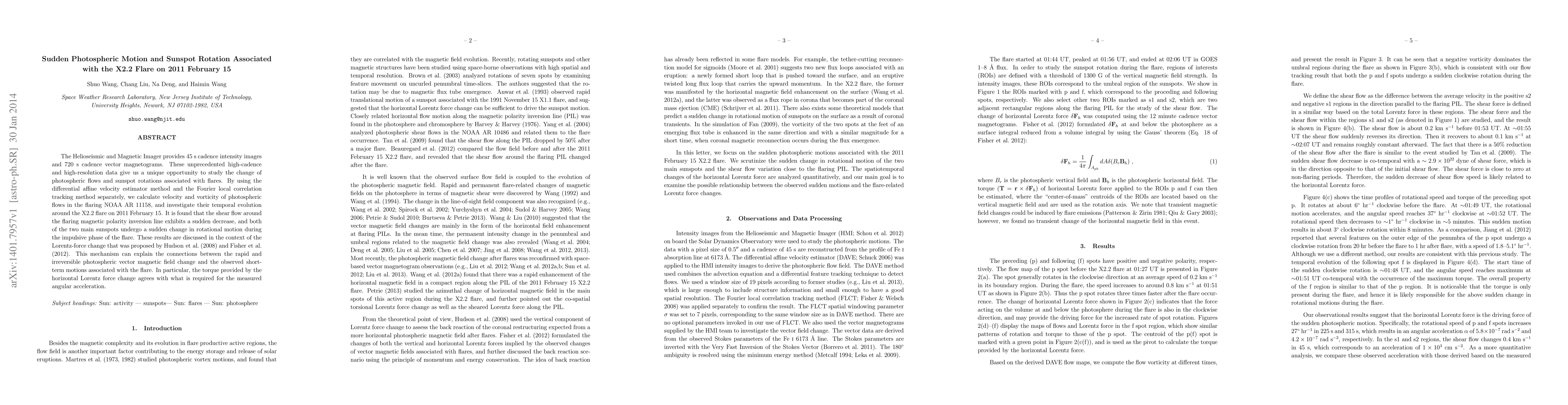 This paper investigates the sudden photospheric motion and sunspot rotation changes associated with the X2.2 flare on February 15, 2011, using high-cadence data from the Helioseismic and Magnetic Imager. It finds a sudden decrease in shear flow and rotational motion changes in sunspots during the flare's impulsive phase, which can be explained by the Lorentz-force change mechanism.