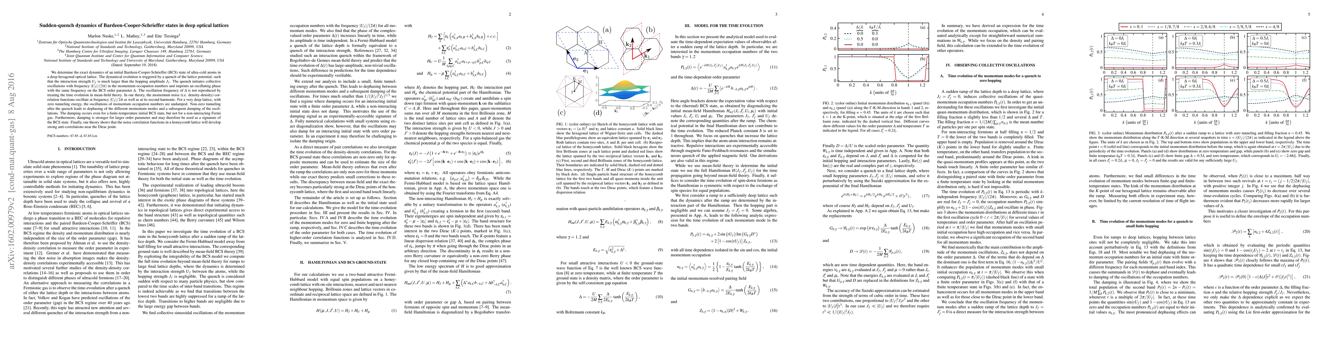 We determine the exact dynamics of an initial Bardeen-Cooper-Schrieffer (BCS) state of ultra-cold atoms in a deep hexagonal optical lattice. The dynamical evolution is triggered by a quench of the lattice potential, such that the interaction strength $U_f$ is much larger than the hopping amplitude $J_f$. The quench initiates collective oscillations with frequency $|U_f|/(2\pi)$ in the momentum occupation numbers and imprints an oscillating phase with the same frequency on the BCS order parameter $\Delta$. The oscillation frequency of $\Delta$ is not reproduced by treating the time evolution in mean-field theory. In our theory, the momentum noise (i.e. density-density) correlation functions oscillate at frequency $|U_f|/2\pi$ as well as at its second harmonic. For a very deep lattice, with zero tunneling energy, the oscillations of momentum occupation numbers are undamped. Non-zero tunneling after the quench leads to dephasing of the different momentum modes and a subsequent damping of the oscillations. The damping occurs even for a finite-temperature initial BCS state, but not for a non-interacting Fermi gas. Furthermore, damping is stronger for larger order parameter and may therefore be used as a signature of the BCS state. Finally, our theory shows that the noise correlation functions in a honeycomb lattice will develop strong anti-correlations near the Dirac point.