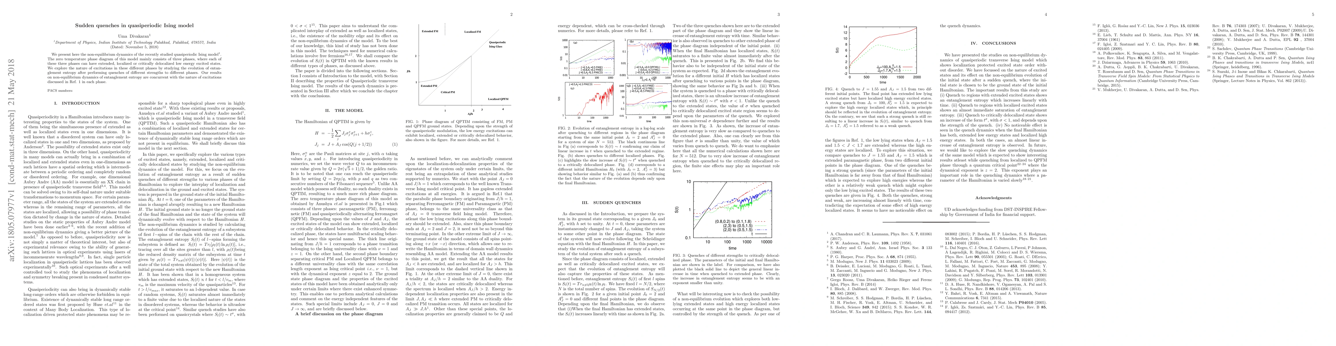 We present here the non-equilibrium dynamics of the recently studied quasiperiodic Ising model. The zero temperature phase diagram of this model mainly consists of three phases, where each of these three phases can have extended, localized or critically delocalized low energy excited states. We explore the nature of excitations in these different phases by studying the evolution of entanglement entropy after performing quenches of different strengths to different phases. Our results on non-equilibrium dynamics of entanglement entropy are concurrent with the nature of excitations discussed in Ref. 1 in each phase.