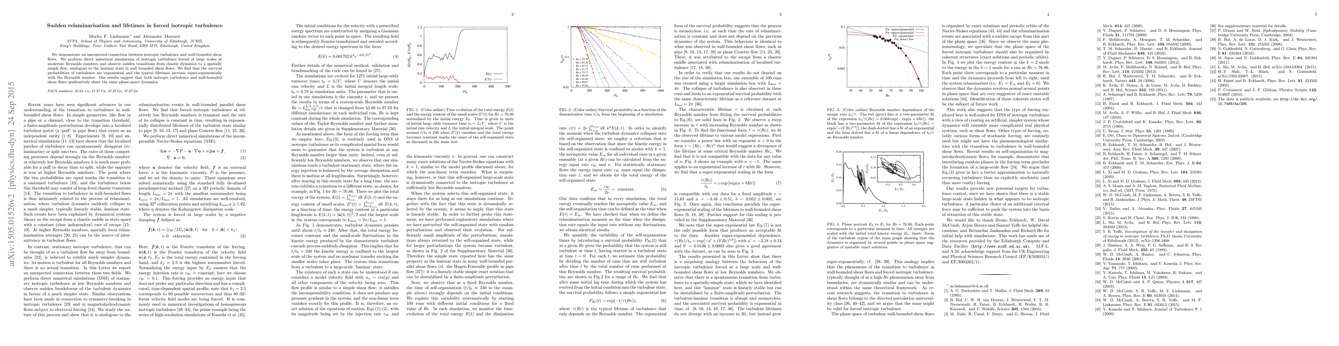This study reveals a surprising link between isotropic turbulence and wall-bounded shear flows through direct numerical simulations, showing sudden transitions to a laminar-like state. The research finds that turbulence survival probabilities are exponential, with lifetimes increasing superexponentially with Reynolds number, indicating shared phase-space dynamics between the two flow types.