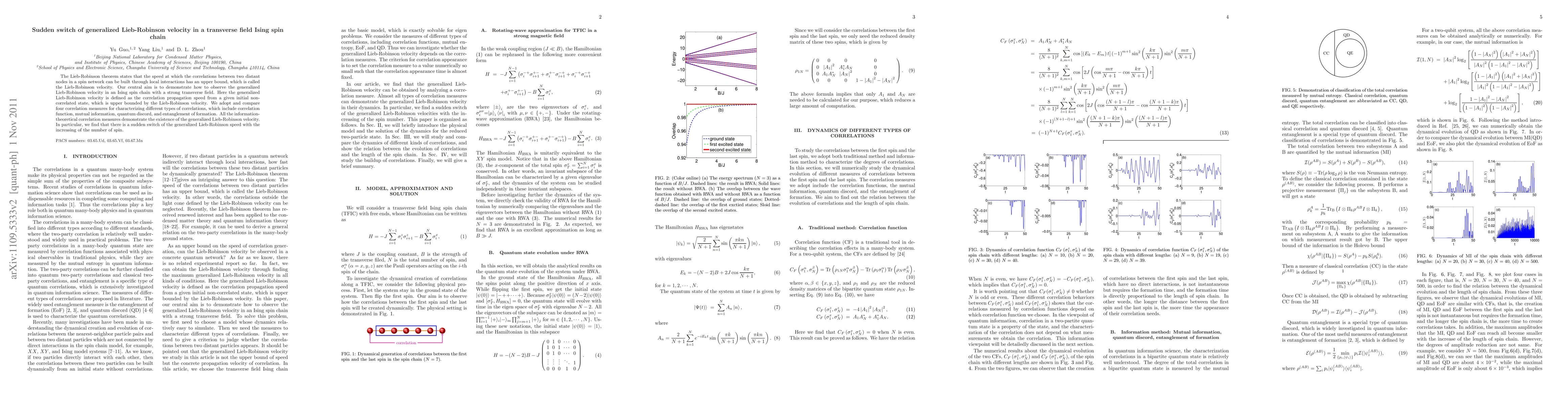 This paper investigates the generalized Lieb-Robinson velocity in a transverse field Ising spin chain, demonstrating a sudden switch in the velocity with increasing spin number. It employs various correlation measures to show the existence of this velocity, revealing distinct behaviors depending on the spin number's parity.