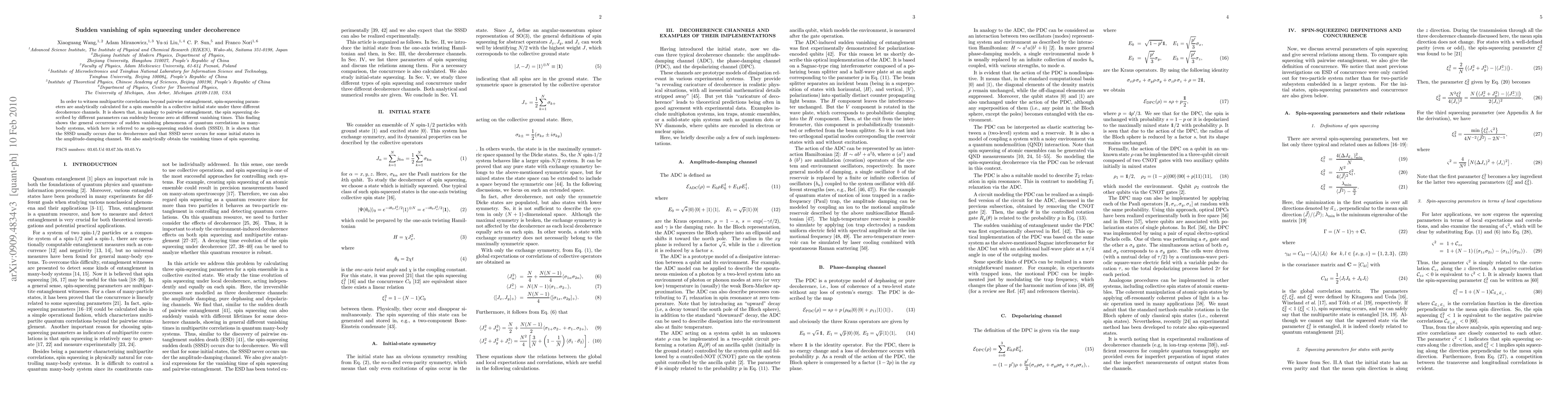 In order to witness multipartite correlations beyond pairwise entanglement, spin-squeezing parameters are analytically calculated for a spin ensemble in a collective initial state under three different decoherence channels. It is shown that, in analogy to pairwise entanglement, the spin squeezing described by different parameters can suddenly become zero at different vanishing times. This finding shows the general occurrence of sudden vanishing phenomena of quantum correlations in many-body systems, which here is referred to as spin-squeezing sudden death (SSSD). It is shown that the SSSD usually occurs due to decoherence and that SSSD never occurs for some initial states in the amplitude-damping channel. We also analytically obtain the vanishing times of spin squeezing.