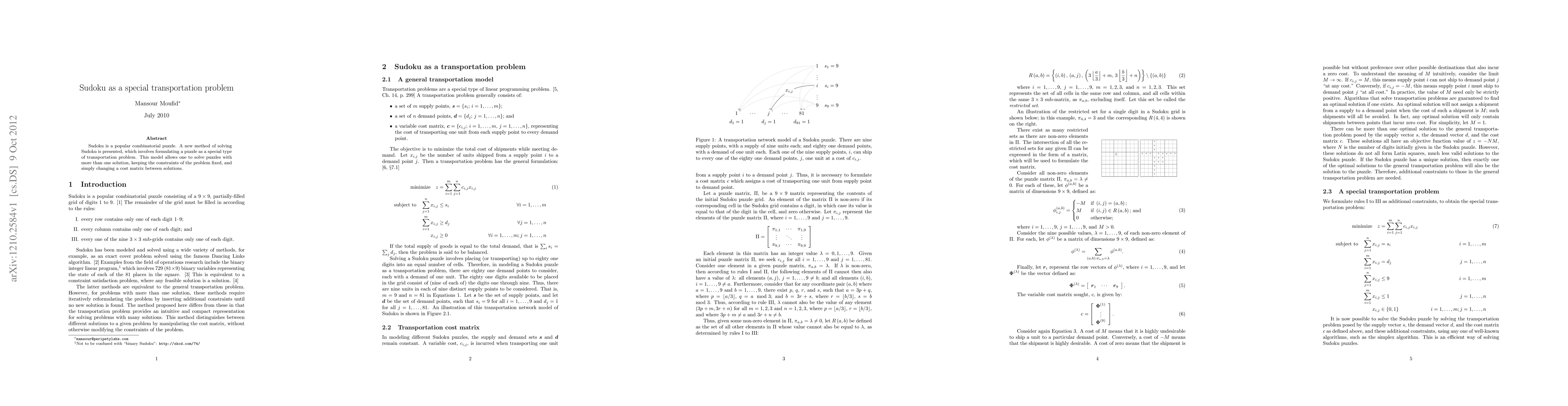 Sudoku is formulated as a special transportation problem for a novel solution method that can handle puzzles with multiple solutions by adjusting a cost matrix while maintaining fixed constraints. This approach enables the exploration of different solutions within the same problem framework.