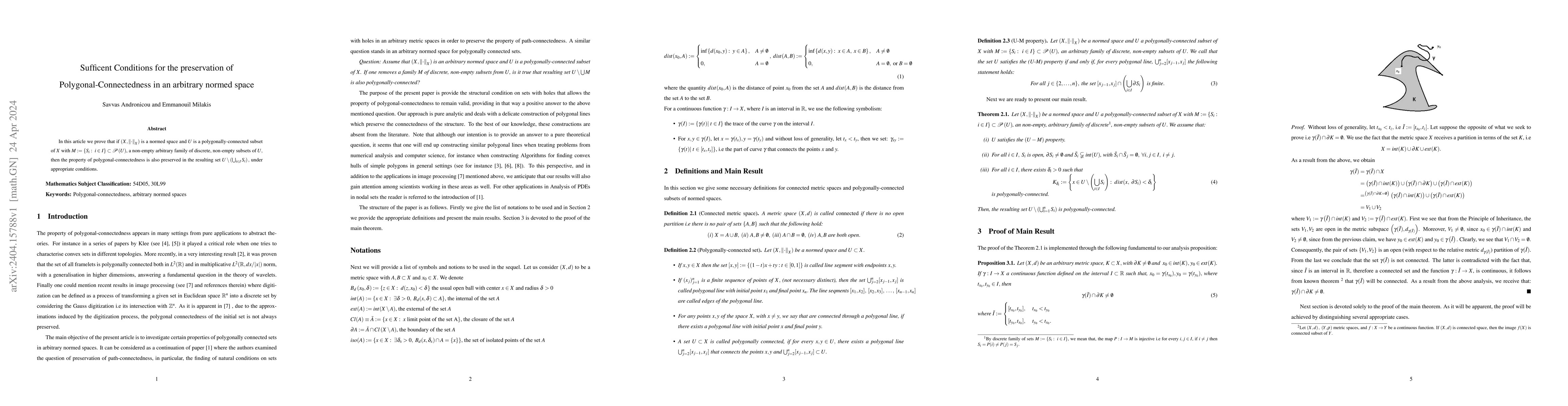 This paper proves that polygonal-connectedness in a normed space $X$ is preserved when removing a family of discrete subsets $M$ from a polygonally-connected subset $U$, provided certain conditions are met. The study focuses on the preservation of polygonal-connectedness in the modified set $U \setminus \bigcup_{i\in I} S_i$.