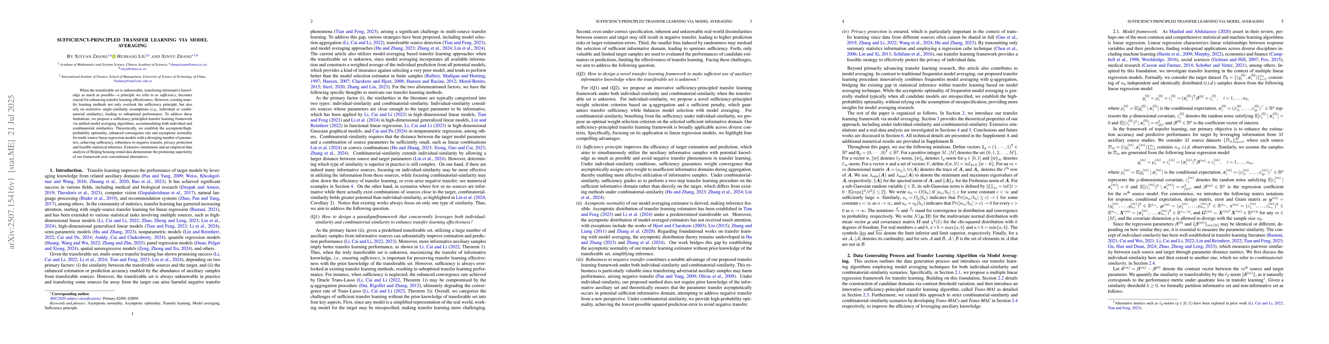 When the transferable set is unknowable, transfering informative knowledge as much as possible\textemdash a principle we refer to as \emph{sufficiency}, becomes crucial for enhancing transfer learning effectiveness. However, existing transfer learning methods not only overlook the sufficiency principle, but also rely on restrictive single-similarity assumptions (\eg individual or combinatorial similarity), leading to suboptimal performance. To address these limitations, we propose a sufficiency-principled transfer learning framework via unified model averaging algorithms, accommodating both individual and combinatorial similarities. Theoretically, we establish the asymptotic/high-probability optimality, enhanced convergence rate and asymptotic normality for multi-source linear regression models with a diverging number of parameters, achieving sufficiency, robustness to negative transfer, privacy protection and feasible statistical inference. Extensive simulations and an empirical data analysis of Beijing housing rental data demonstrate the promising superiority of our framework over conventional alternatives.